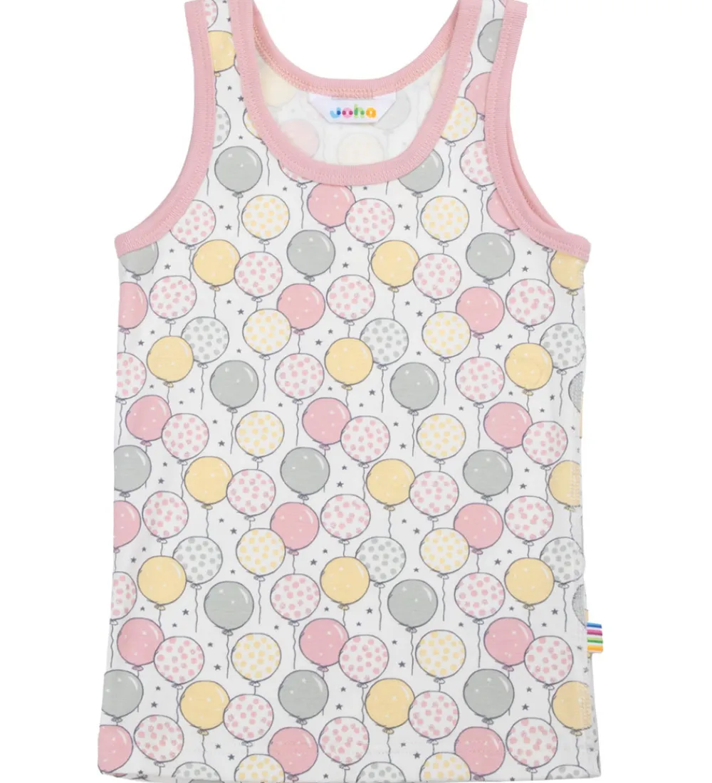 Fin Joha undertrøje i hvid, prydet med farverige ballonprint i rosa, gul og støvet grøn med glimmertråd på nogle af prikkerne i de lyserøde balloner. Undertrøjen har en behagelig pasform og er ideel til enhver dagligdags situation.
