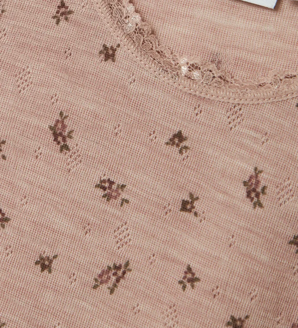 Sød Name It undertrøje i støvet rosa med blomsterprint og fint hulmønster samt blondekanter i hals- og ærmeåbninger. Undertrøjen har en rund halsudskæring og brede skulderstropper. Den er fremstillet i blødt og åndbart merinould.