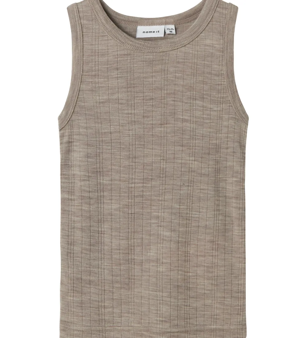 Lækker Name It undertrøje i grå med fin ribstruktur. Undertrøjen har en rund halsudskæring og brede skulderstropper. Den er fremstillet i blødt og åndbart merinould.