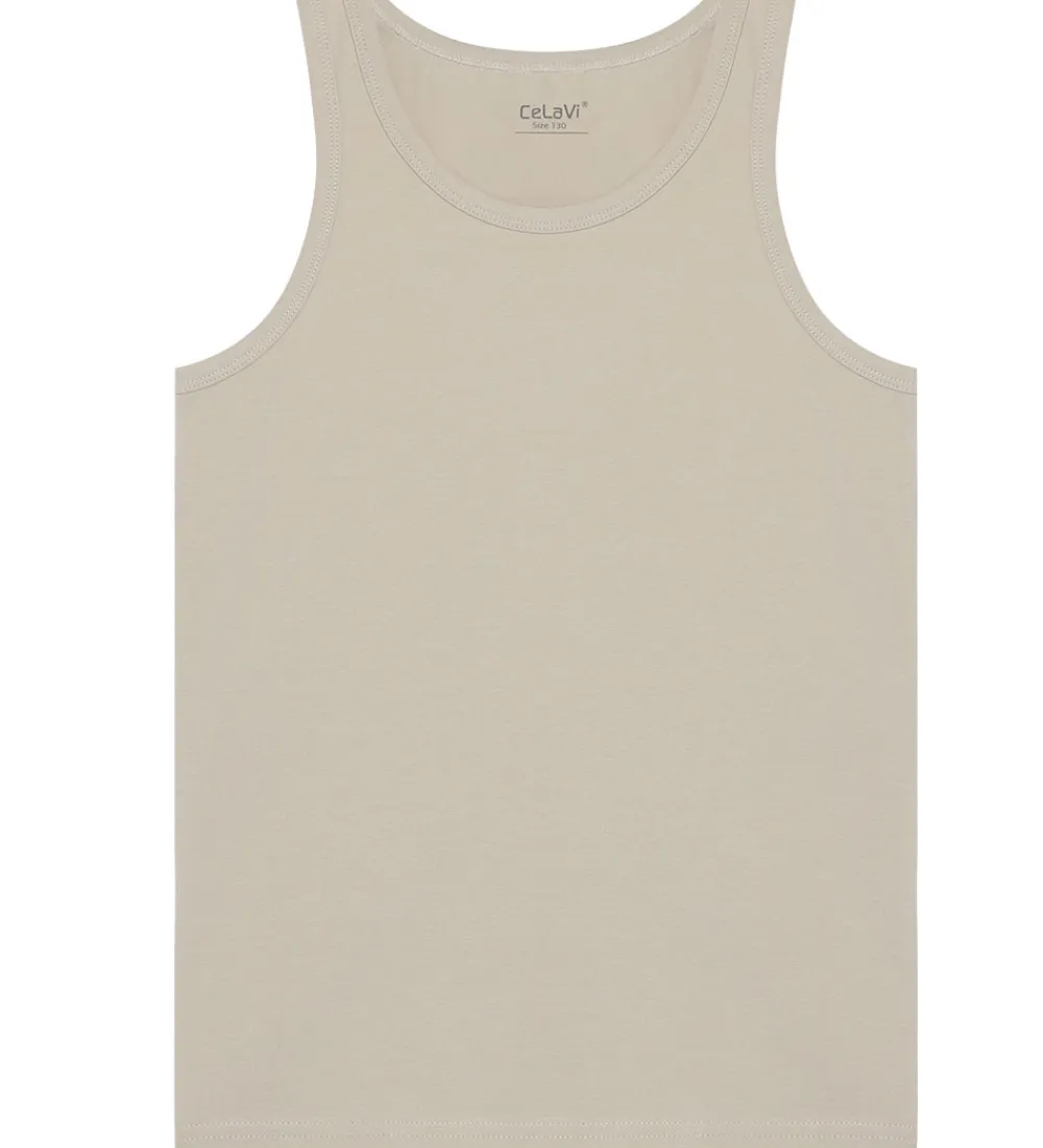 Flotte CeLaVi undertrøjer solgt i en 2-pak. Den ene undertrøje er ensfarvet beige, mens den anden er beige med et alloverprint af dinosaurer i armygrøn og mørkeblå. Undertrøjerne har brede skulderstropper og er fremstillet i en blød kvalitet.