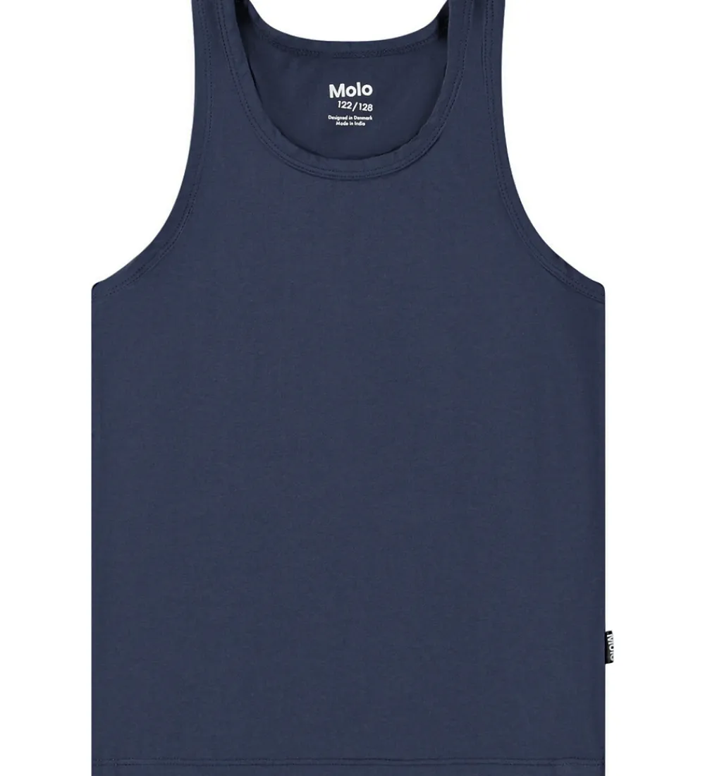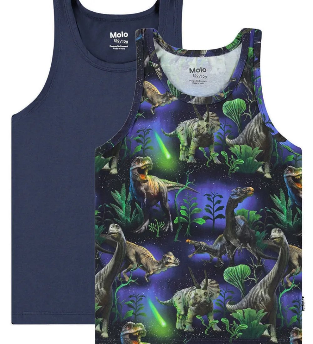 Fantastiske Molo undertrøjer i en 2-pak. Den ene er ensfarvet mørkeblå, mens den anden har et livligt dinosaurprint med grønne og blå nuancer. Begge undertrøjer er designet med brede stropper, der giver et moderne udtryk. Molo sikrer en stilren og unik stil med disse undertrøjer.