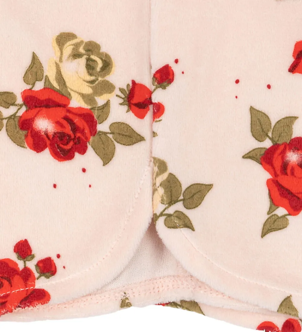 Smukke Konges Sløjd velourbukser i lyserosa, dekoreret med et blomstrende rosemønster i nuancer af rød og grøn.