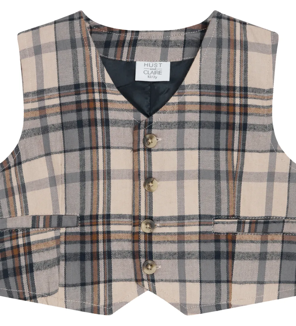 Charmerende Hust and Claire vest i en klassisk ternet beige med nuancer af sort og orange. Vesten har en flot knaplukning og to praktiske lommer, hvilket giver et stilfuldt og funktionelt look.