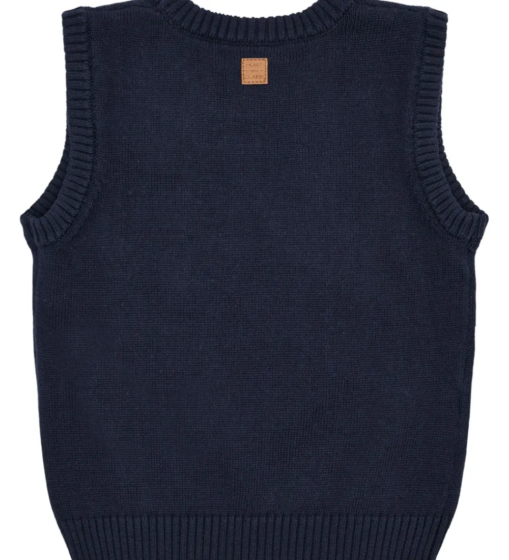 Fin Hust and Claire vest i mørkeblå med et stort rensdyr på fronten lavet af frotté. Hust and Claire vesten har crewneck og ribkanter uden ærmer, hvilket gør den ideel til lag-på-lag. Et charmerende valg til garderoben.