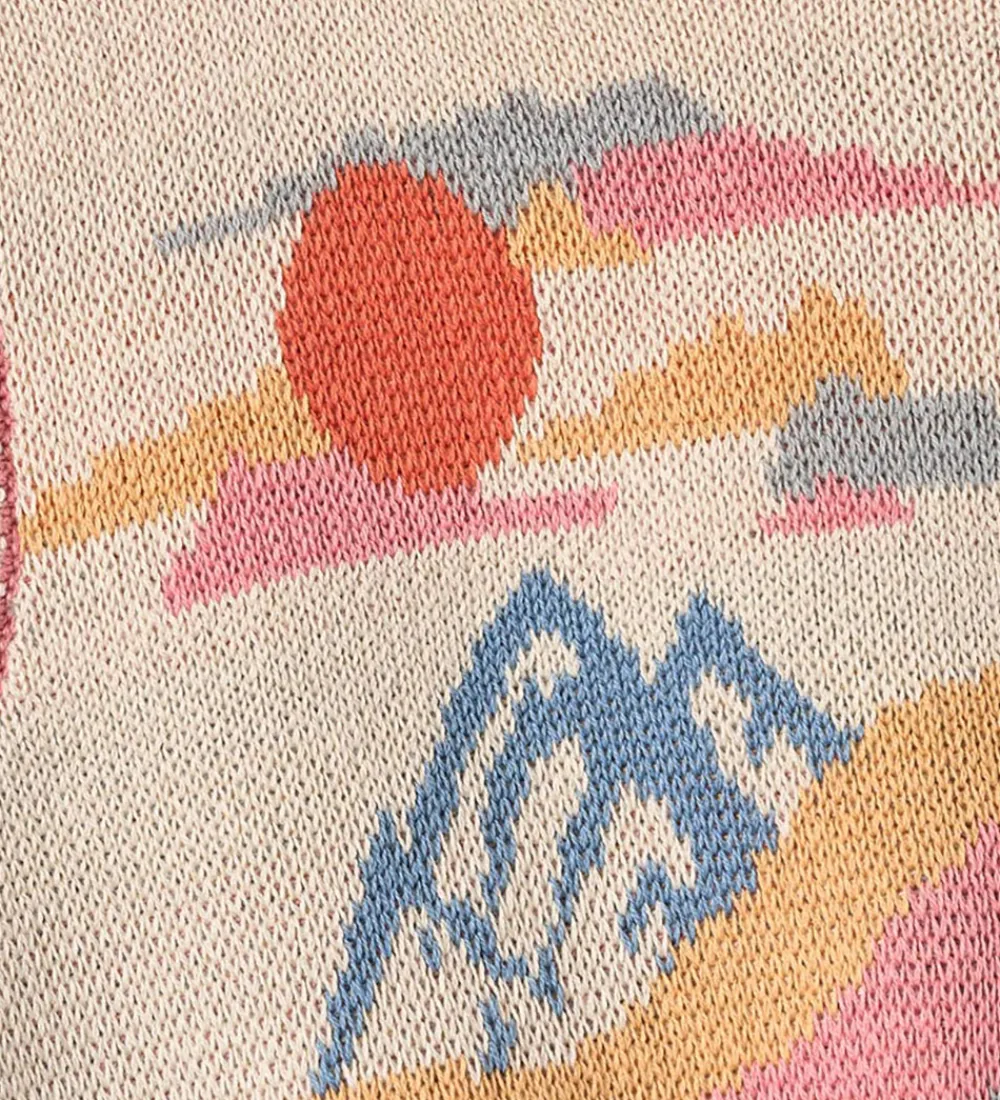 Fin Wheat vest i beige med landskabsprint i gule, rosa og blå nuancer. Vesten har strikket struktur med en rund halsudskæring og ribkanter i alle åbninger. Ved venstre skulder er der en træknap, som gør det nemt at få vesten over hovedet.