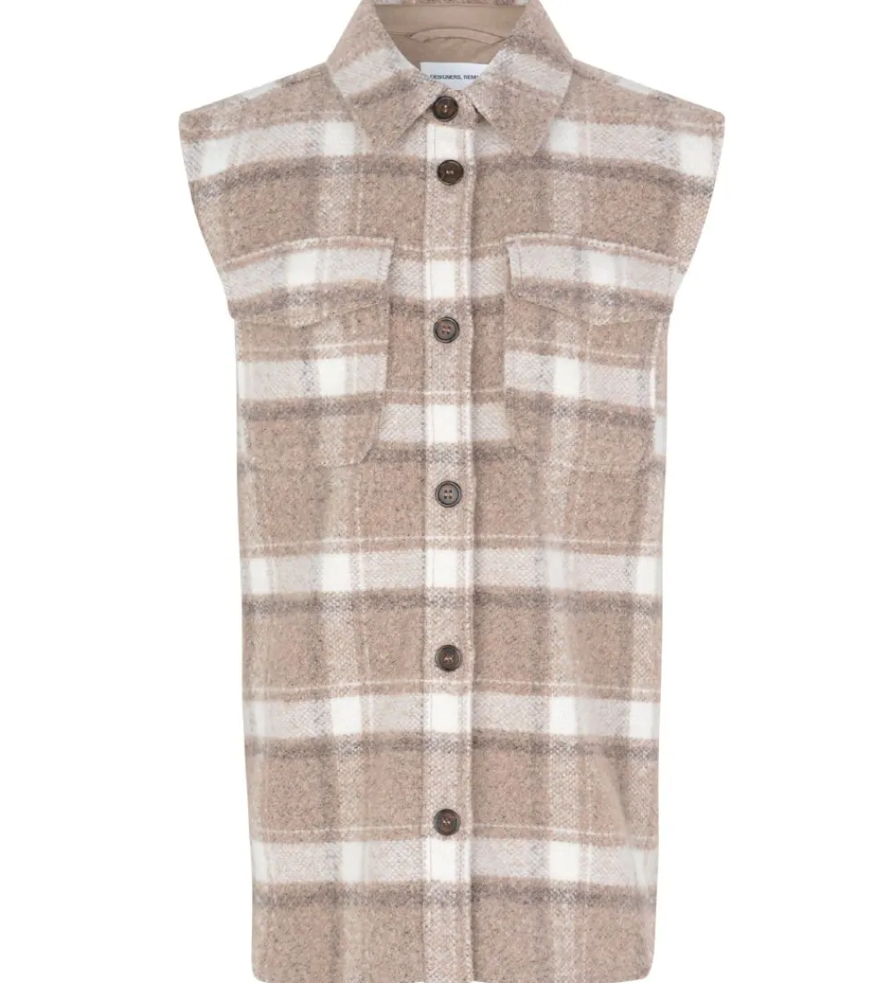 Fin Designers Remix vest med et ternet mønster i beige, hvid og brun.