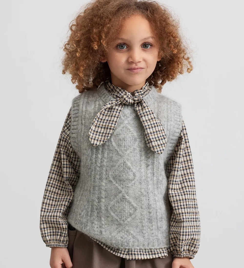 Flot MarMar vest i meleret grå i en kraftigt strikket kvalitet. MarMar vesten har et elegant kabelstrikket mønster på fronten, der giver et klassisk udtryk. Vesten er ærmeløs, hvilket gør den velegnet til lag-på-lag styling.