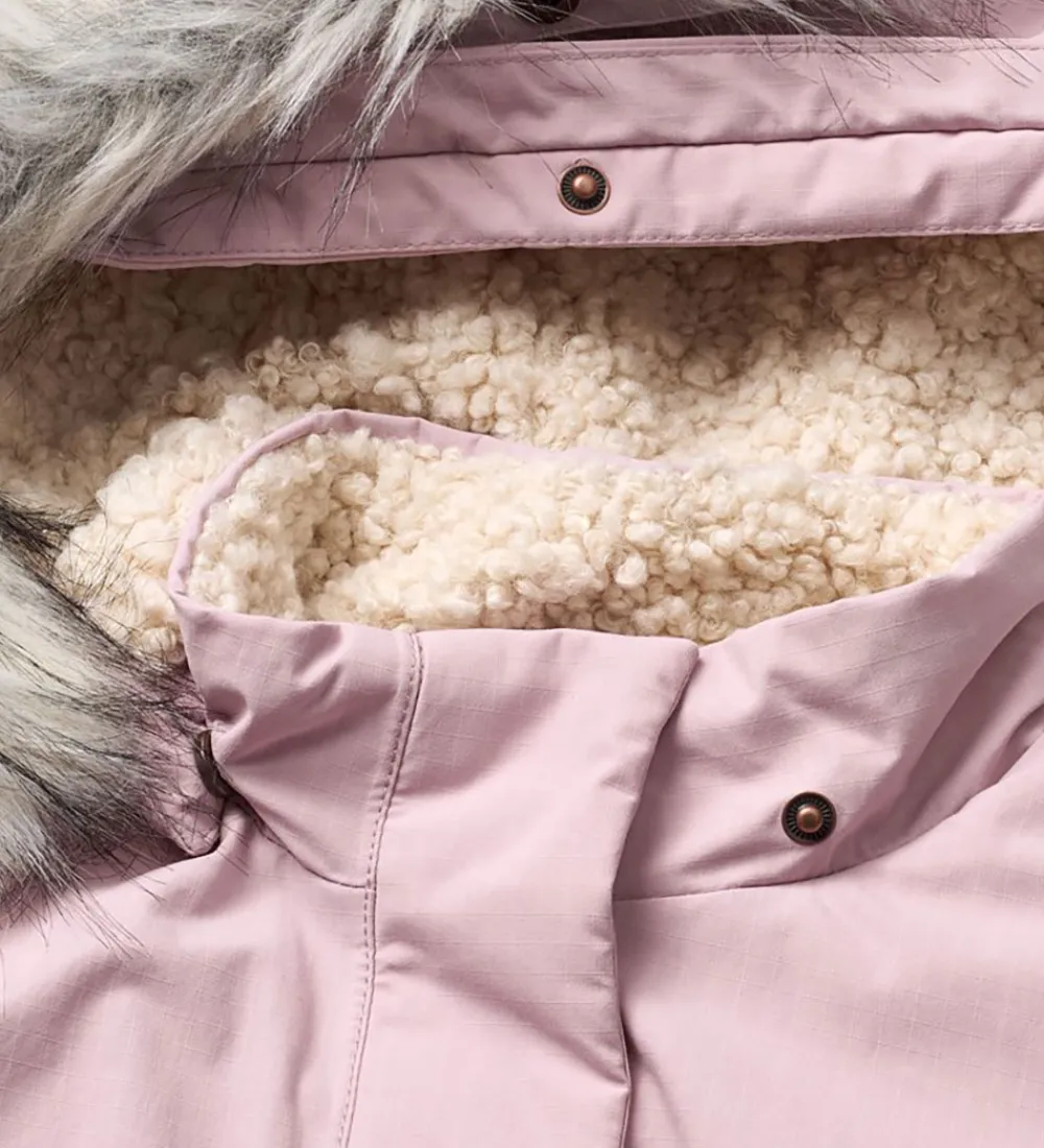 Vinterfrakken er vatteret, og indvendigt har den fleecefor i hætten, hagebeskytteren, ryggen og lommer, mens resten har et glatvævet for.