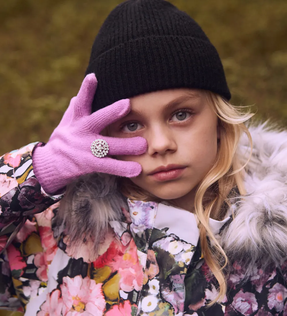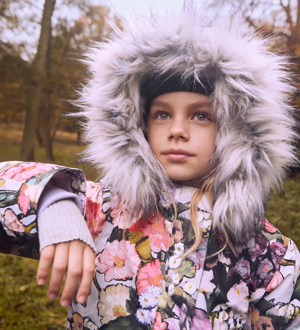 Flot Molo vinterfrakke med et multifarvet alloverblomsterprint i akvarelstil. Bagtil er der også et reflekslogoprint.