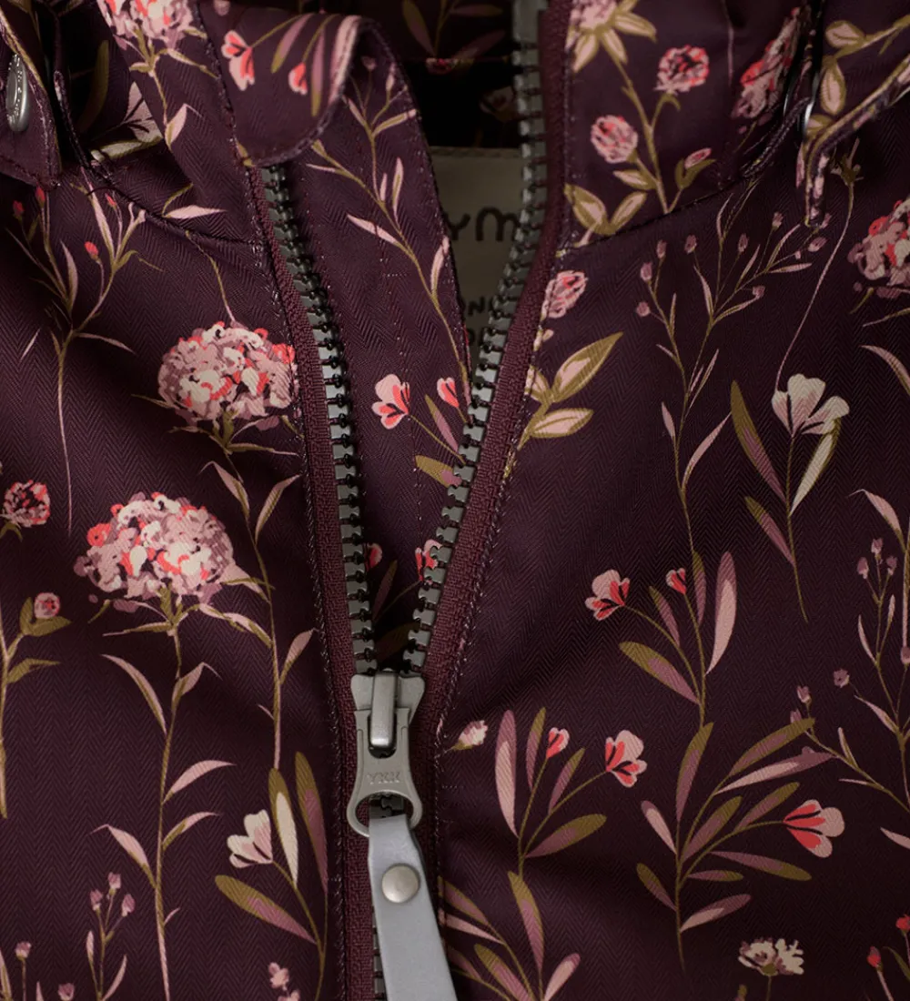 Fin Minymo vinterjakke i mørk lilla med et alloverprint af blomster i rosa, lilla og grønne nuancer. Vinterjakken har refleksdetaljer på hætten og på ryggen.