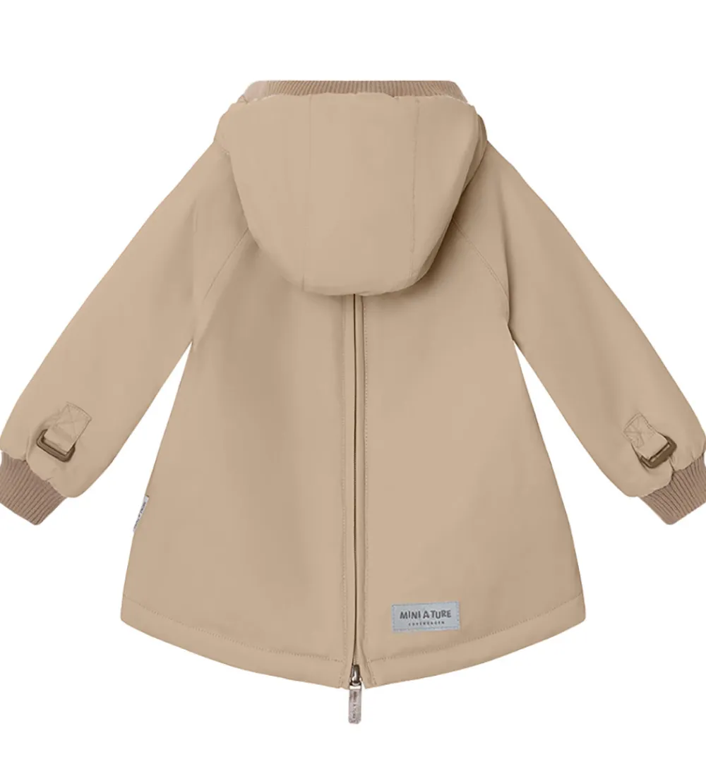 Mini A Ture vinterjakken er en anorak model, så lynlåsen sidder bagpå, op langs ryggen. Ved håndleddene er der brede ribkanter, og hætten har en bred ribkant i ansigtsåbningen så den sidder tæt, samt er der lækkert for indvendigt. Vinterjakken er foret med et glatvævet materiale i ærmerne, mens den er foret med blødt, og lækkert for i kroppen.