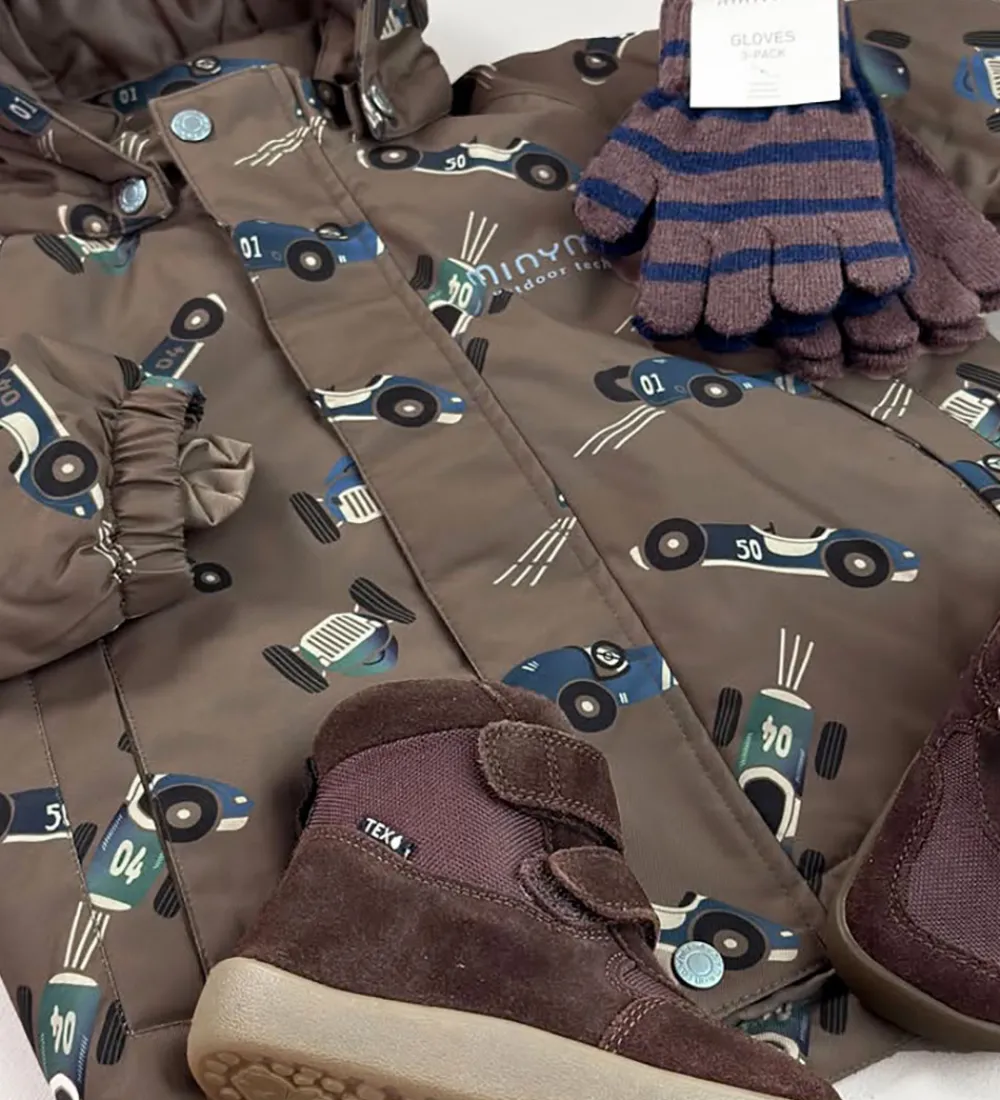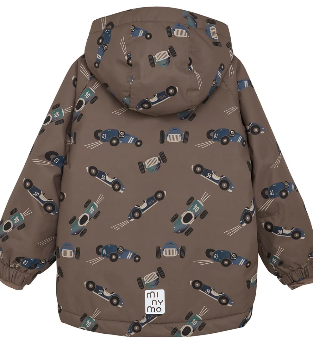 Smart Minymo vinterjakke i brun med et alloverprint af racerbiler i blå og grønne nuancer. Vinterjakken har praktiske refleksdetaljer.