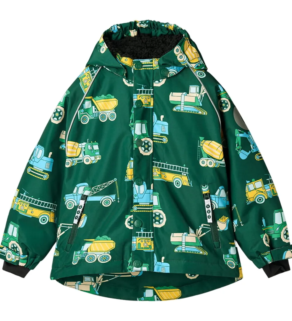 Skøn Småfolk vinterjakke i mørkegrøn med et alloverprint af farverige arbejdsbiler. Rundt om ærmene er der praktiske reflekspipings.
