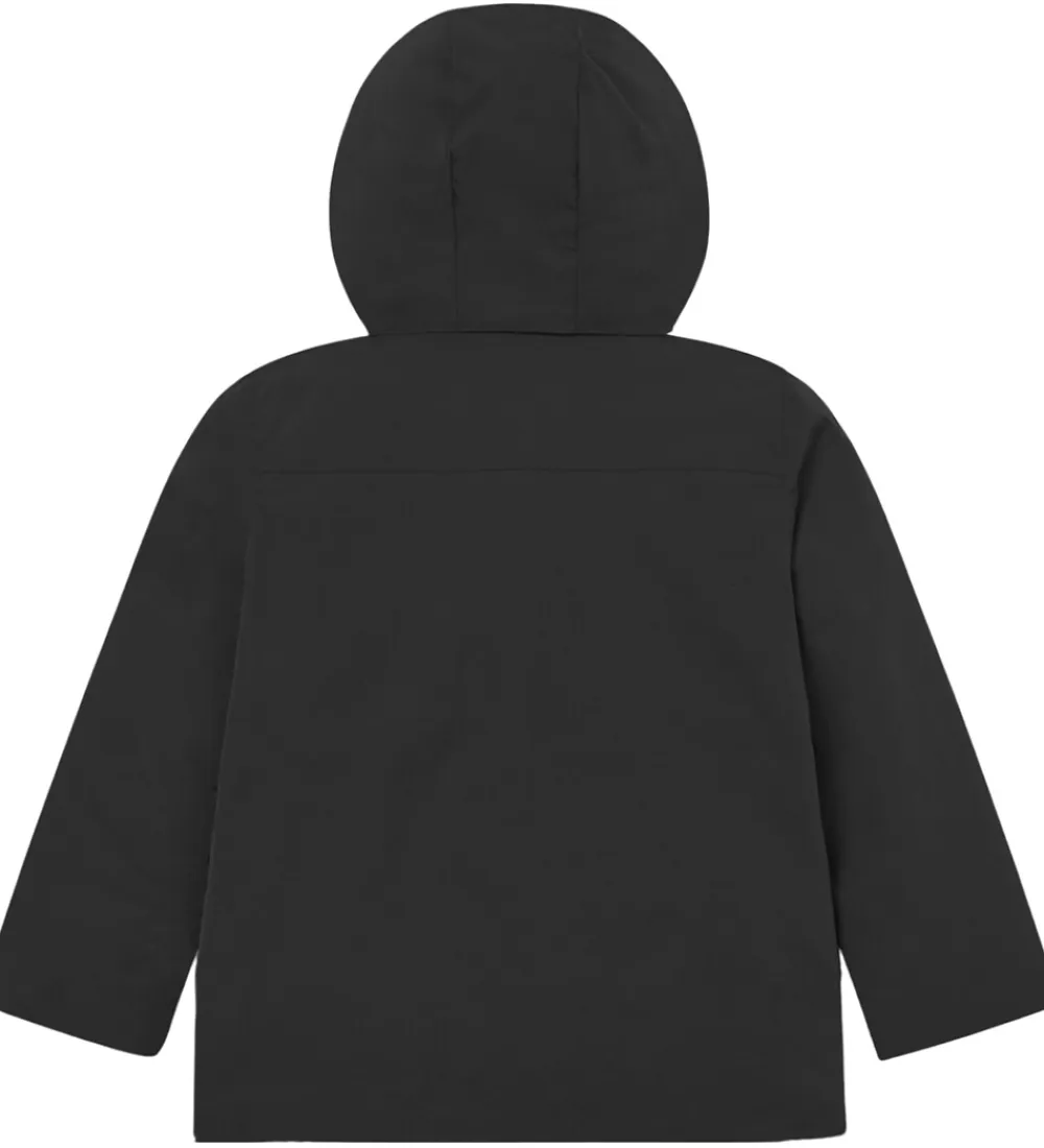Elegant Les Deux vinterjakke i dyb sort nuance med et Les Deux logo-refleksprint på brystet.