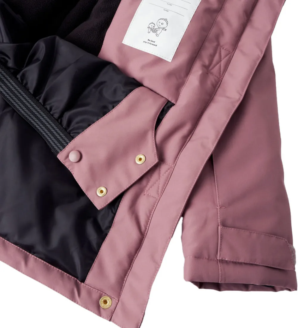 Name It vinterjakken har en aftagelig hætte, som sidder fast med skjulte trykknapper omkring halskraven, og pelskanten kan tages af og på ved hjælp af små knapper, og på indersiden er der en elastikkant, så hætten sidder godt til hovedet. Ærmerne har praktiske snefang med et hul til tommelfingeren, og ærmekanterne kan strammes ind med velcro. Omkring livet, indvendigt, er der et praktisk snefang med gummi, som lukkes med to trykknapper, samt er der elastik i taljen så den sidder godt til. Vinterjakken er godt vatteret, og indvendig har den et glatvævet for.