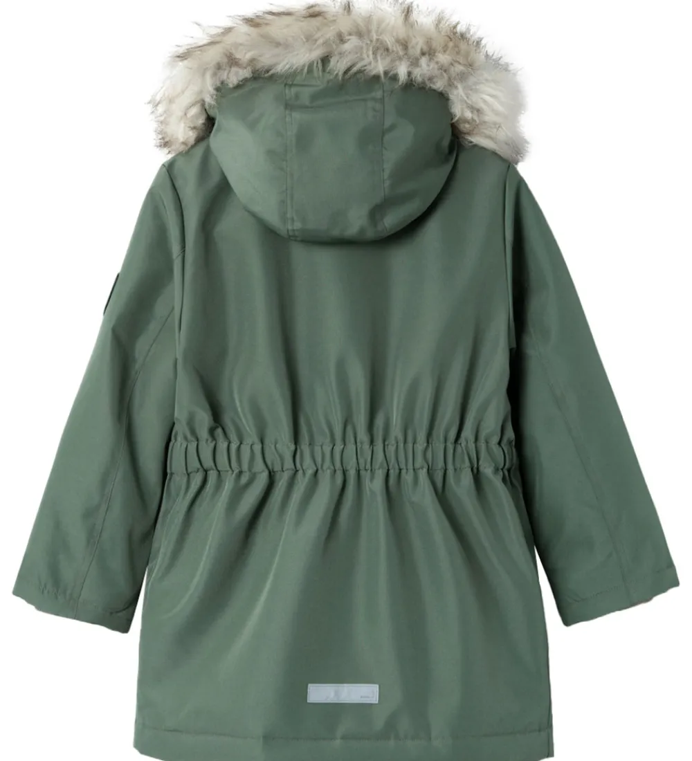 Name It vinterjakken er en lang parka-model. Den har en aftagelig hætte, som sidder fast med skjulte trykknapper omkring halskraven, og pelskanten kan tages af og på ved hjælp af små knapper. Ærmerne har snefang med brede ribkanter.