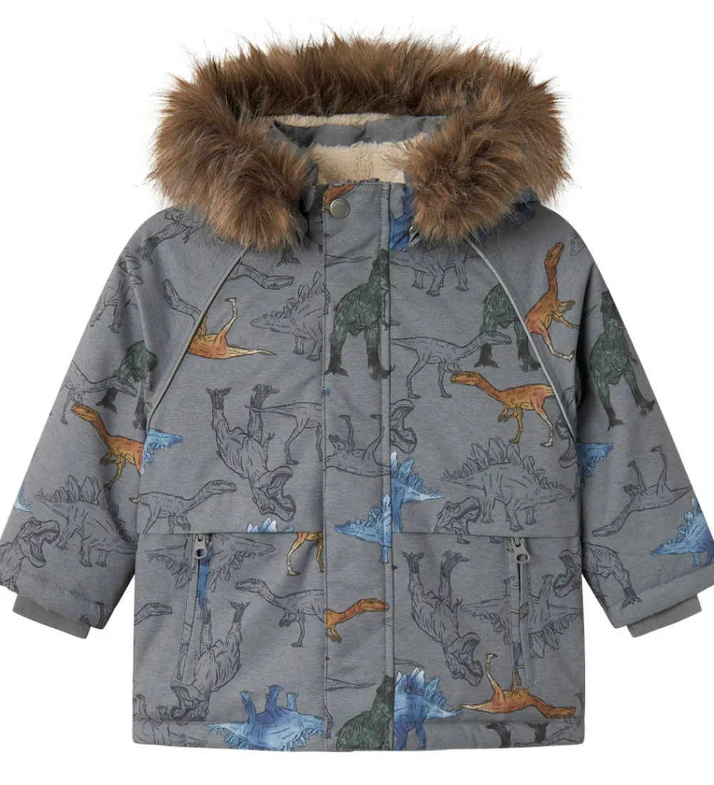 Fed Name It vinterjakke i grå med et alloverprint af dinosaurer, samt en flot kant af imiteret pels i brun på hætten.