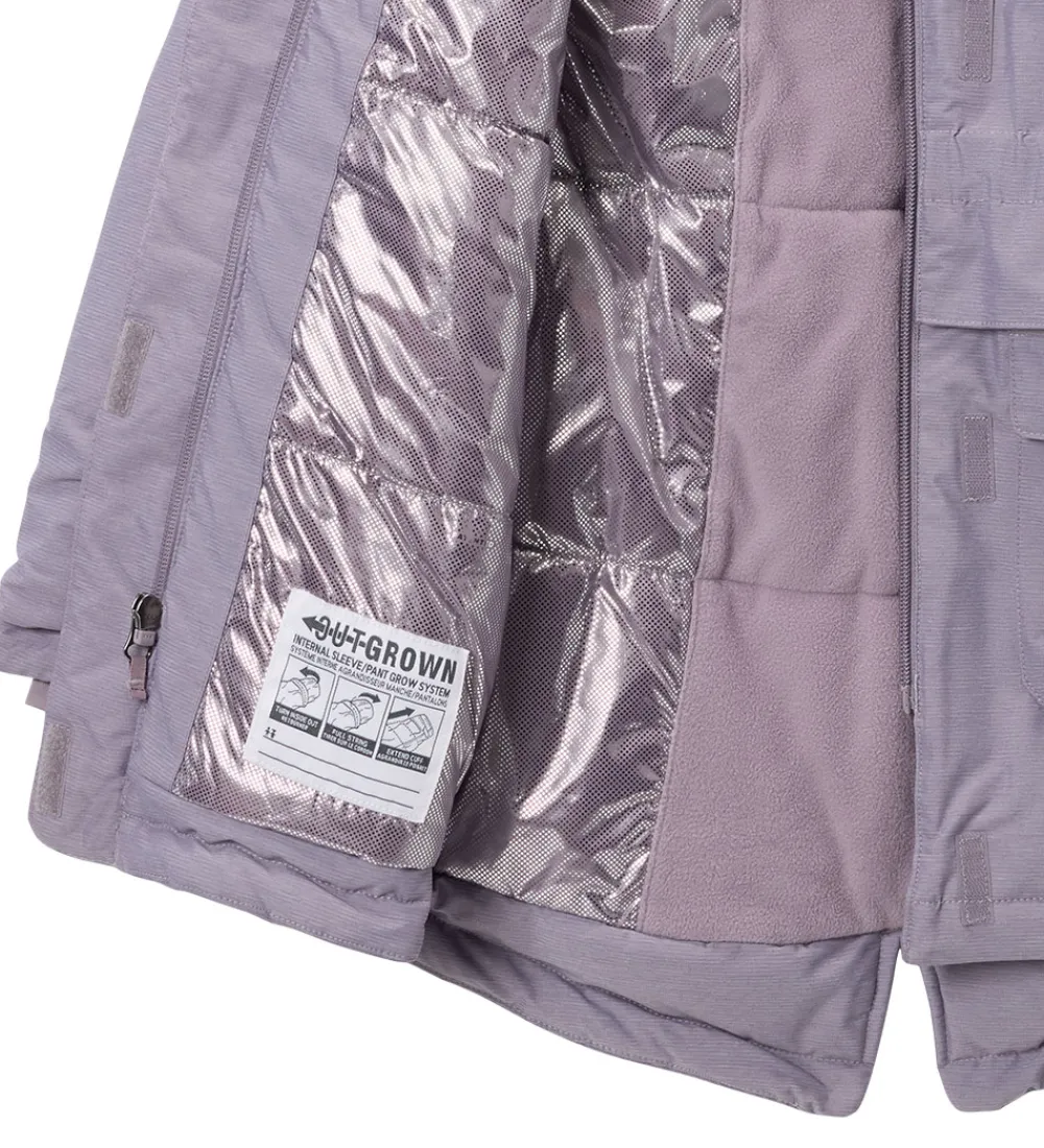Smart Columbia vinterjakke i lilla med et lille logoprint på venstre bryst. Hætten har en flot kant af imiteret pels.