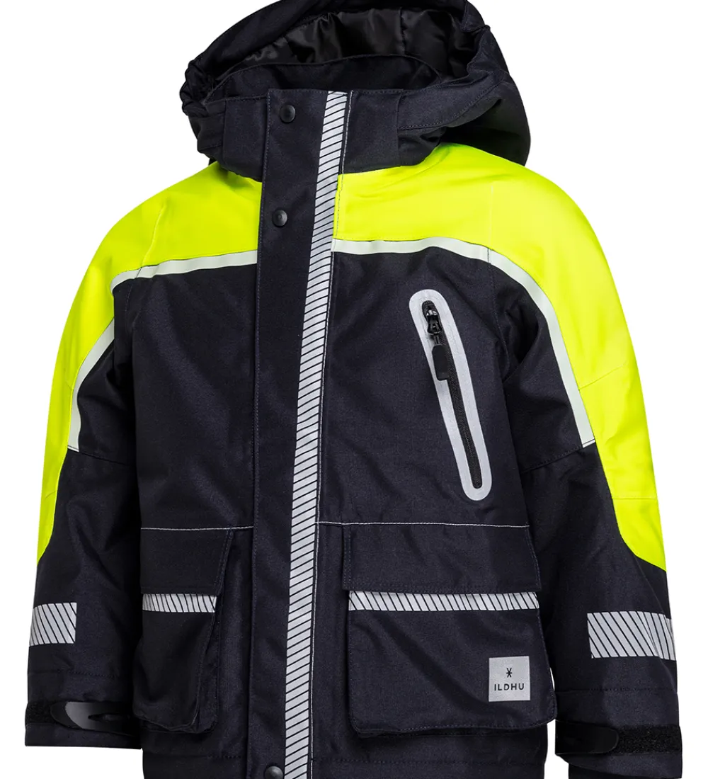 Lækker ILDHU vinterjakke i navyblå og neongul med mange reflekser for høj synlighed i trafikken.