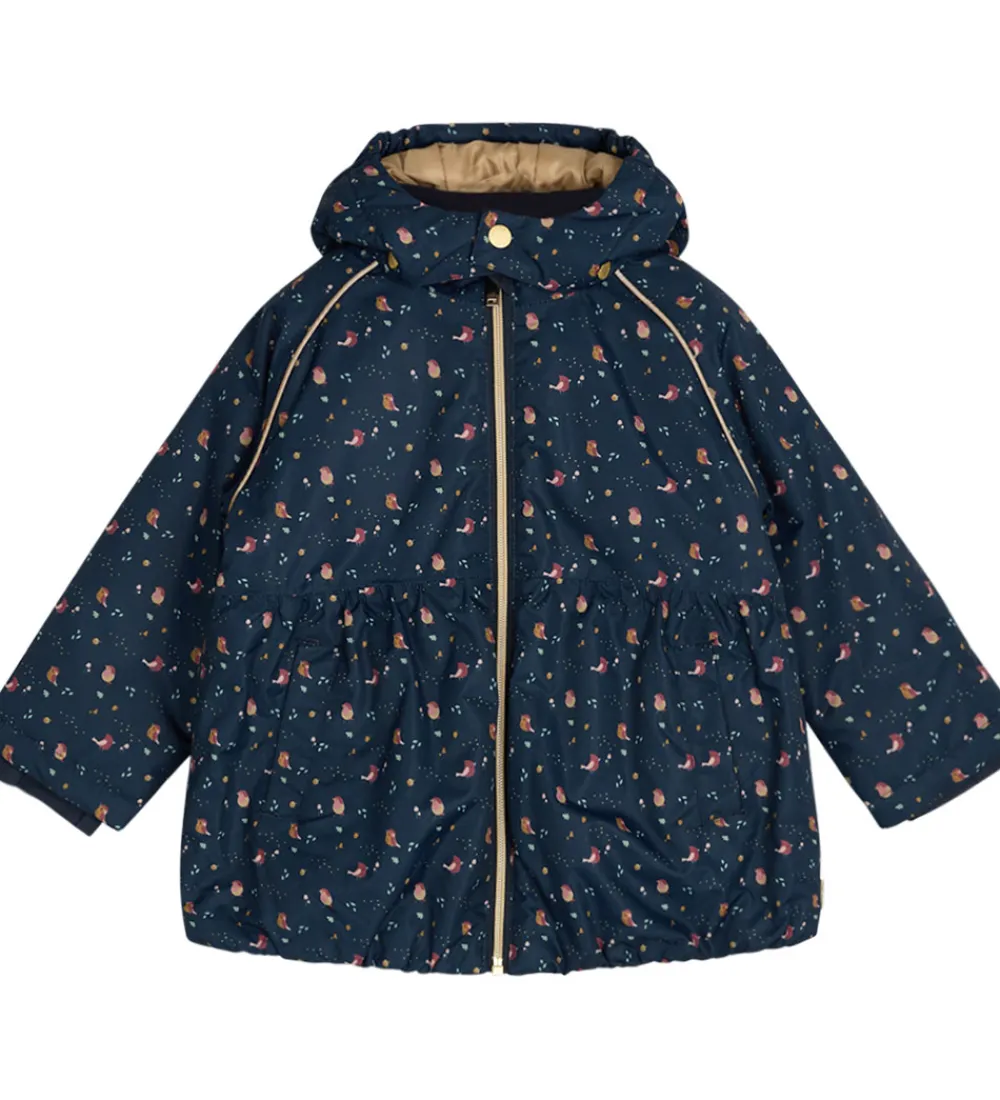 Lækker Hust and Claire vinterjakke i navyblå med et alloverprint af små fugle i rosaog gyldenbrun. Vinterjakken har fine, gyldne trykknapper, lynlås og reflekspipings.