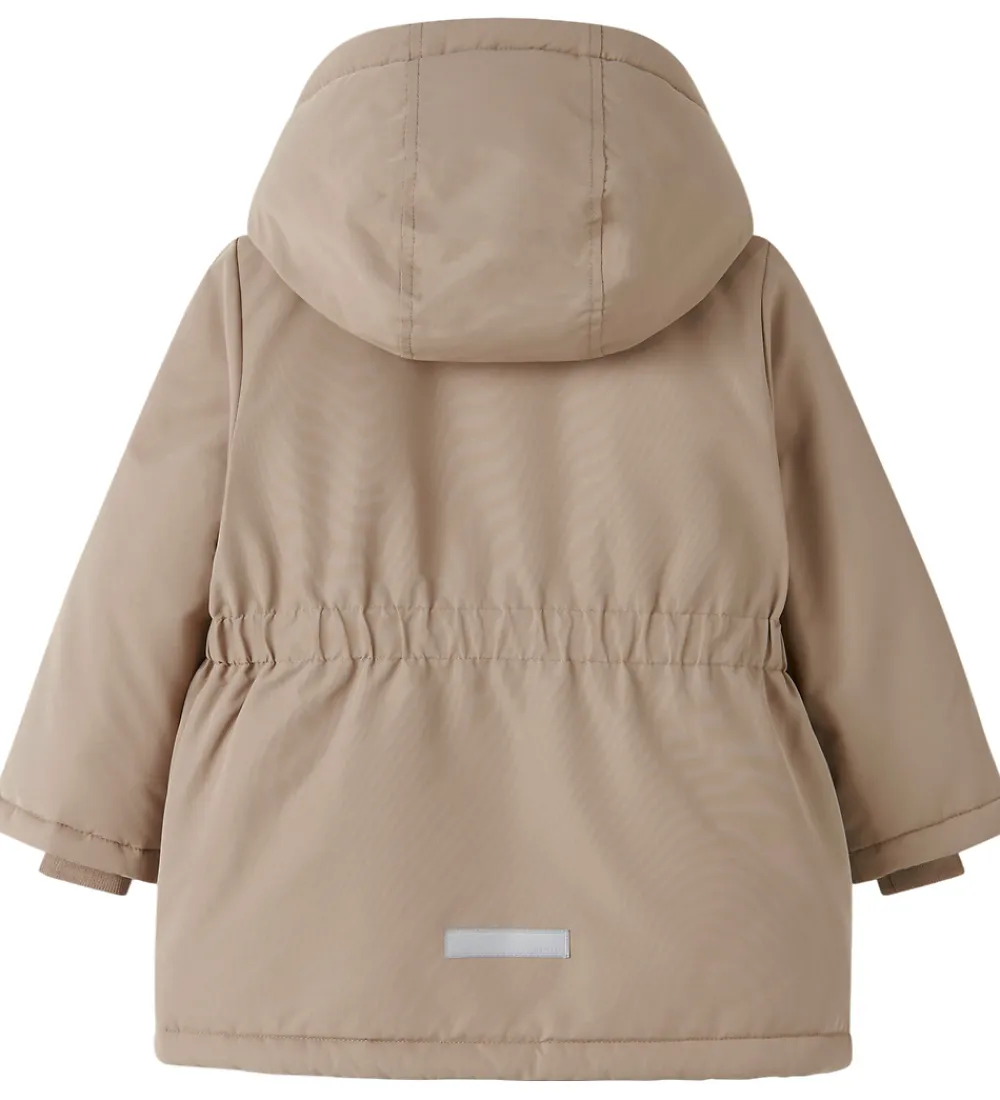 Name It vinterjakken har en aftagelig hætte, som sidder fast langs kraven med trykknapper. Vinterjakken lukkes fortil med en gennemgående lynlås med hagebeskytter og dobbelt vindstolpe, hvoraf den yderste kan lukkes med trykknapper. I ærmerne er der snefang med brede ribkanter. Fortil er der en lomme i hver side, som lukkes med trykknapper.