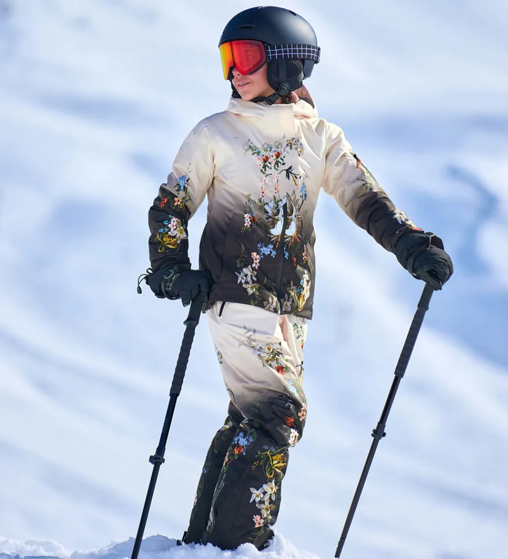 Flot Molo vinterjakke, som fra top til bund toner sig fra sort til beige og har et smukt, farverigt blomsterprint og praktiske refleksprint på højre overarm og nederst på ryggen.