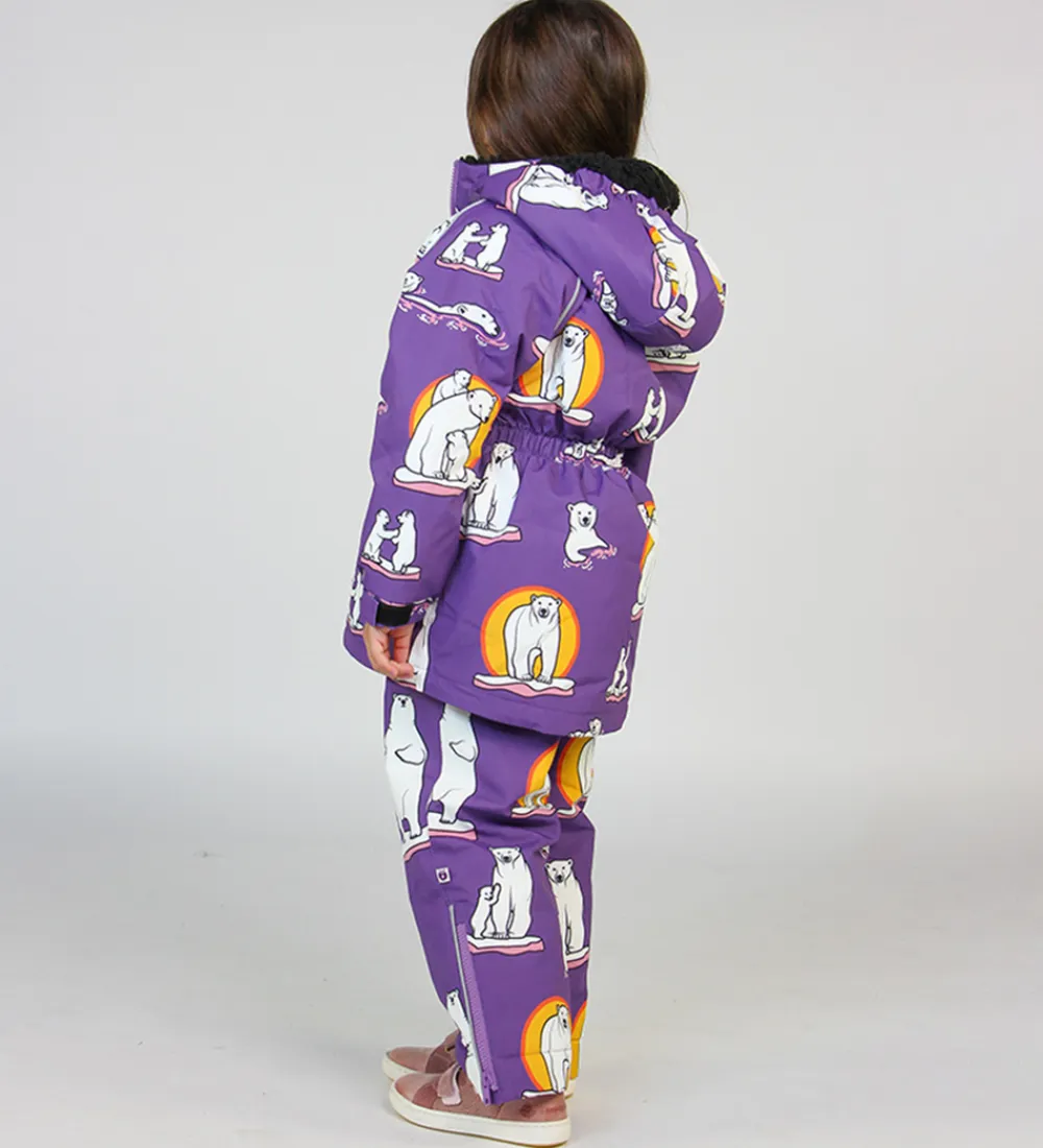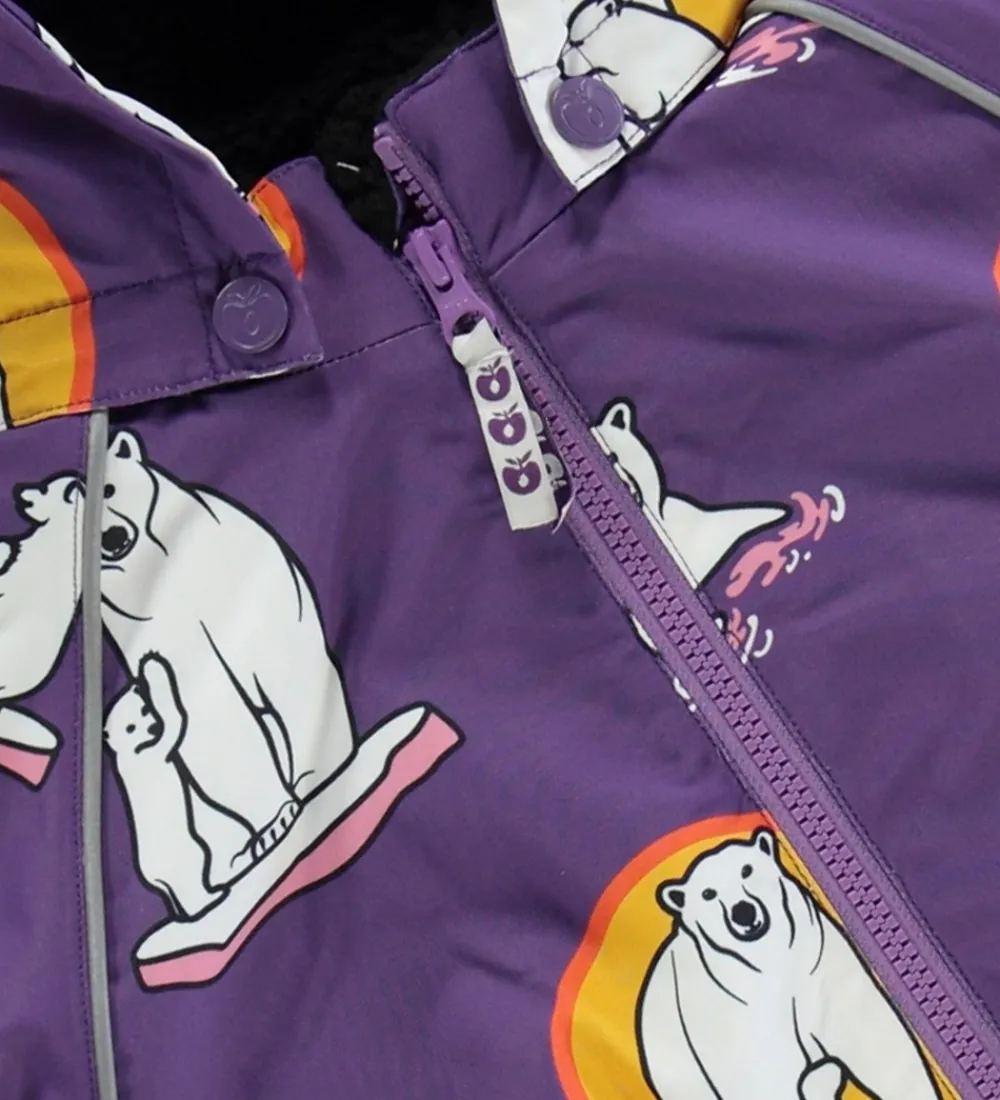 Skøn Småfolk vinterjakke i lilla med et alloverprint af søde isbjørne.
