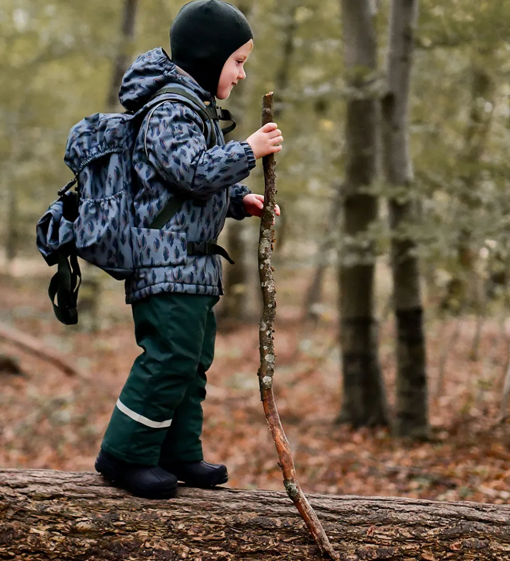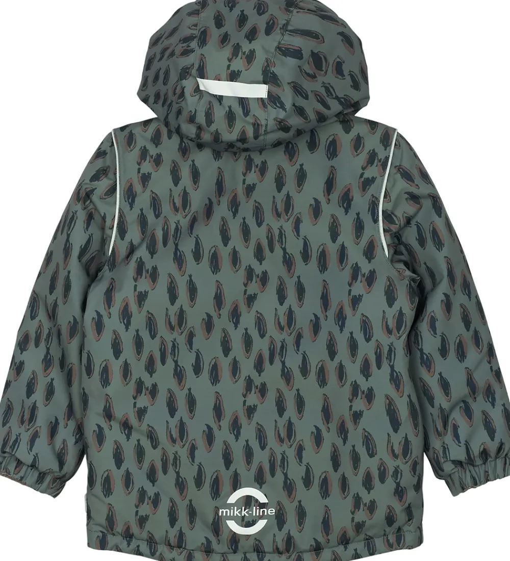 Pæn Mikk-Line vinterjakke i en mørk, støvet grøn farve og med et bladlignende allovermønster. Vinterjakken har refleksdetaljer på hætten, nederst på ryggen og omkring skuldrene.