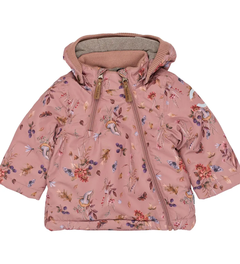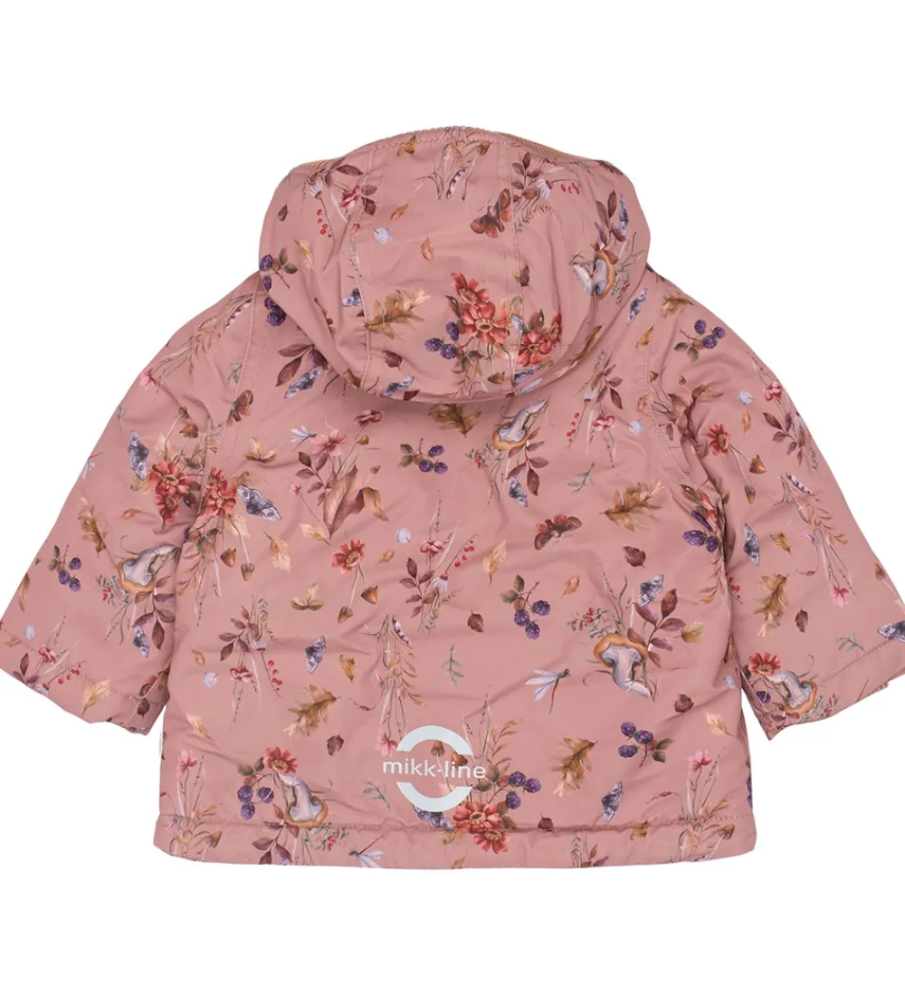 Flot Mikk-Line vinterjakke i rosa med efterårsprint af blomster, svampe og insekser. Vinterjakken har også praktiske refleksprint.