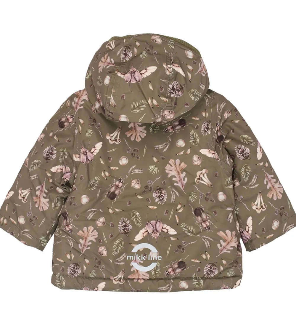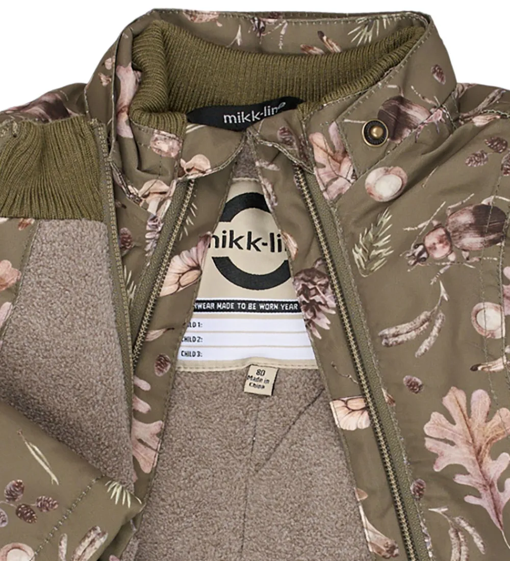 Flot Mikk-Line vinterjakke i mørkegrøn med et alloverskovprint med biller og blade i brune nuancer. Vinterjakken har også praktiske refleksprint.