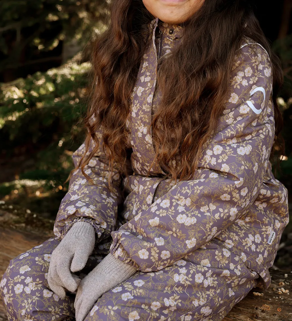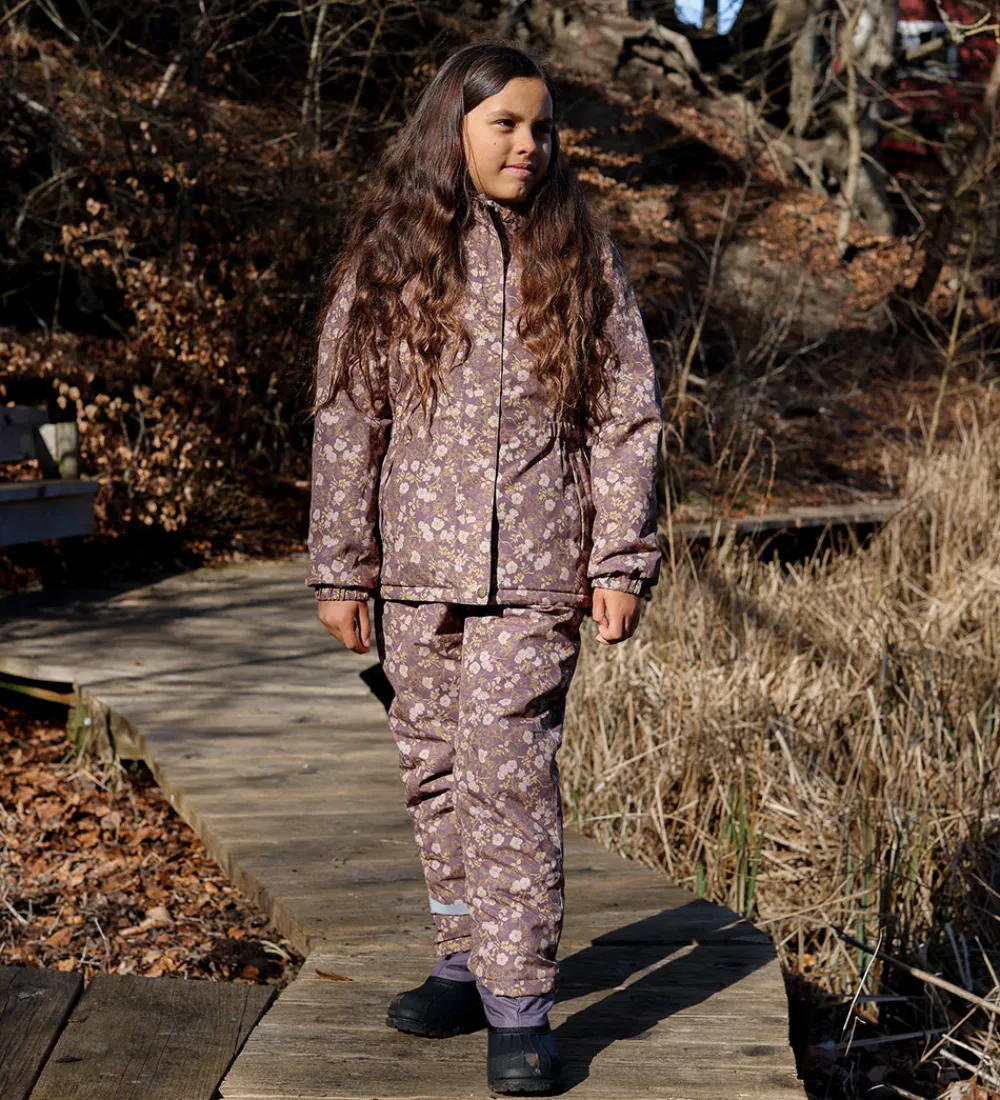Pæn Mikk-Line vinterjakke i en mørk, støvet lilla farve og med et alloverblomsterprint i guld og beige. Vinterjakken har refleksdetaljer på hætten, nederst på ryggen og omkring skuldrene.