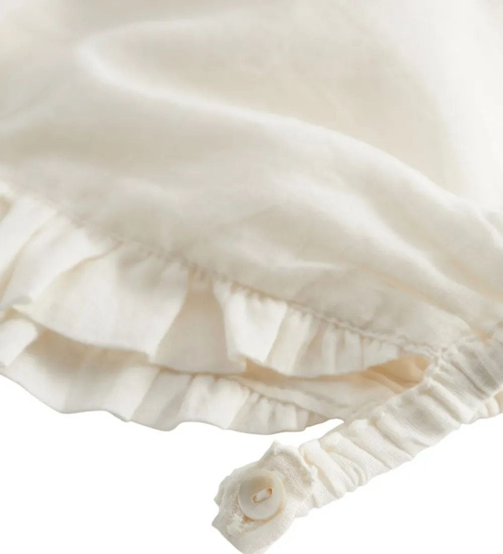 Elegant MarMar babyhjelm i hvid. MarMar babyhjelmen er designet med en rund hovedform og har smukke flæsedetaljer langs kanten, samt et flot hulmønster. Den lukkes under hagen med et elastisk og justerbart bånd.