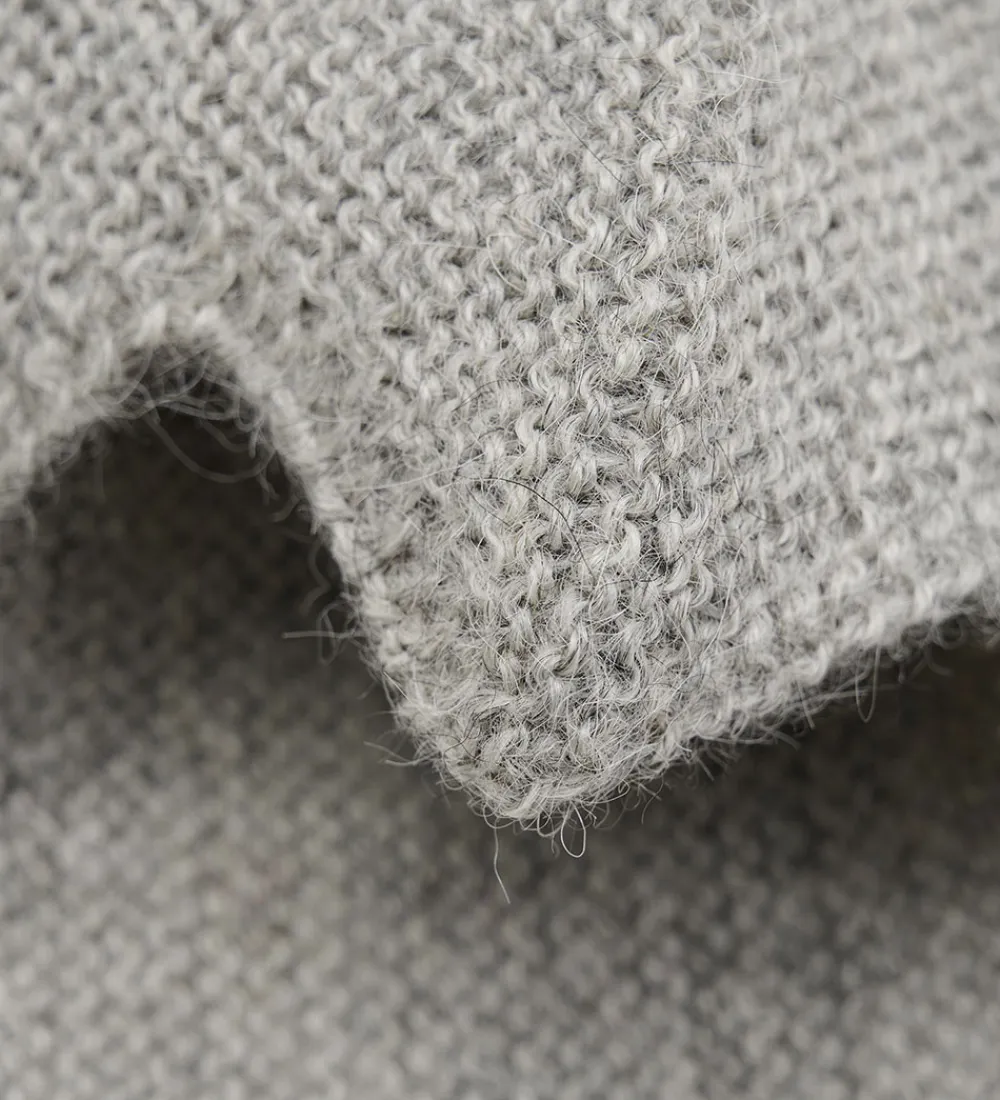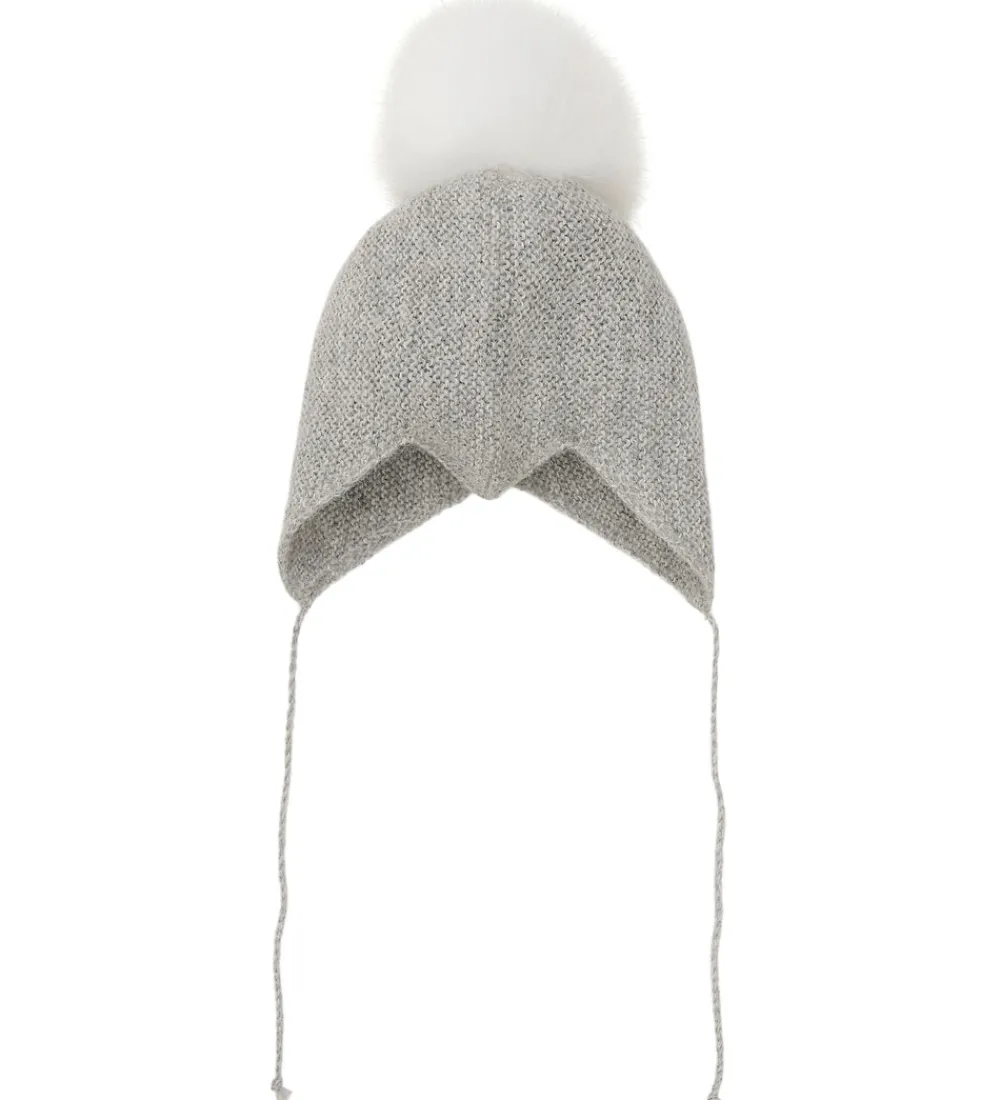 Fin Huttelihut babyhjelm strikket af blødt alpakauld i en meleret lysegrå og med en hvid pelskvast på toppen.