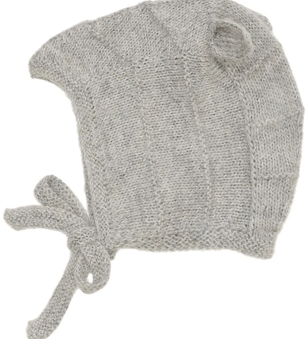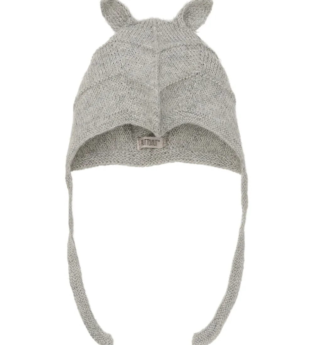 Fin Huttelihut babyhjelm strikket af blødt alpakauld i meleret lysegrå og med søde ører på toppen.