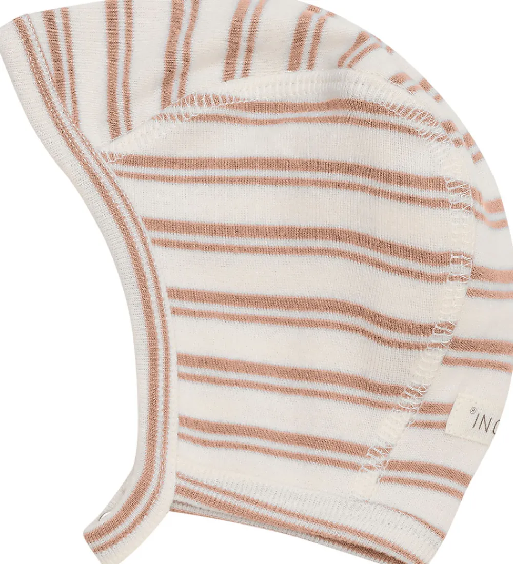 Sød Fixoni babyhjelm med et stribet mønster i hvide og brune nuancer. Fixoni babyhjelmen har en rund hovedform og lukkes under hagen med en trykknap med to indstillinger.