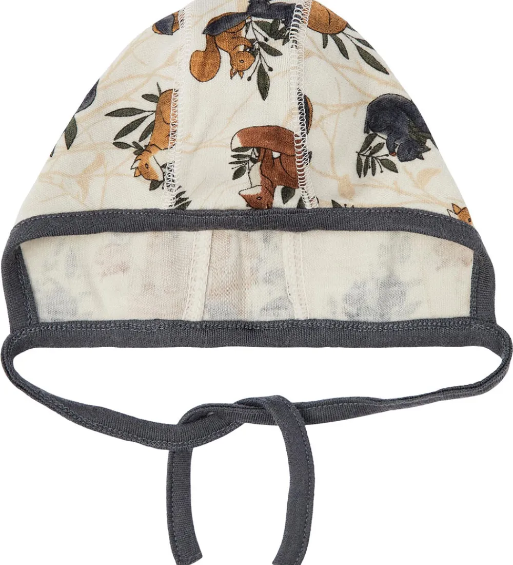 Sød Name It babyhjelm i cremehvid med fint dyreprint med egern, ræve og pindsvin i navy, brune og grønne nuancer.