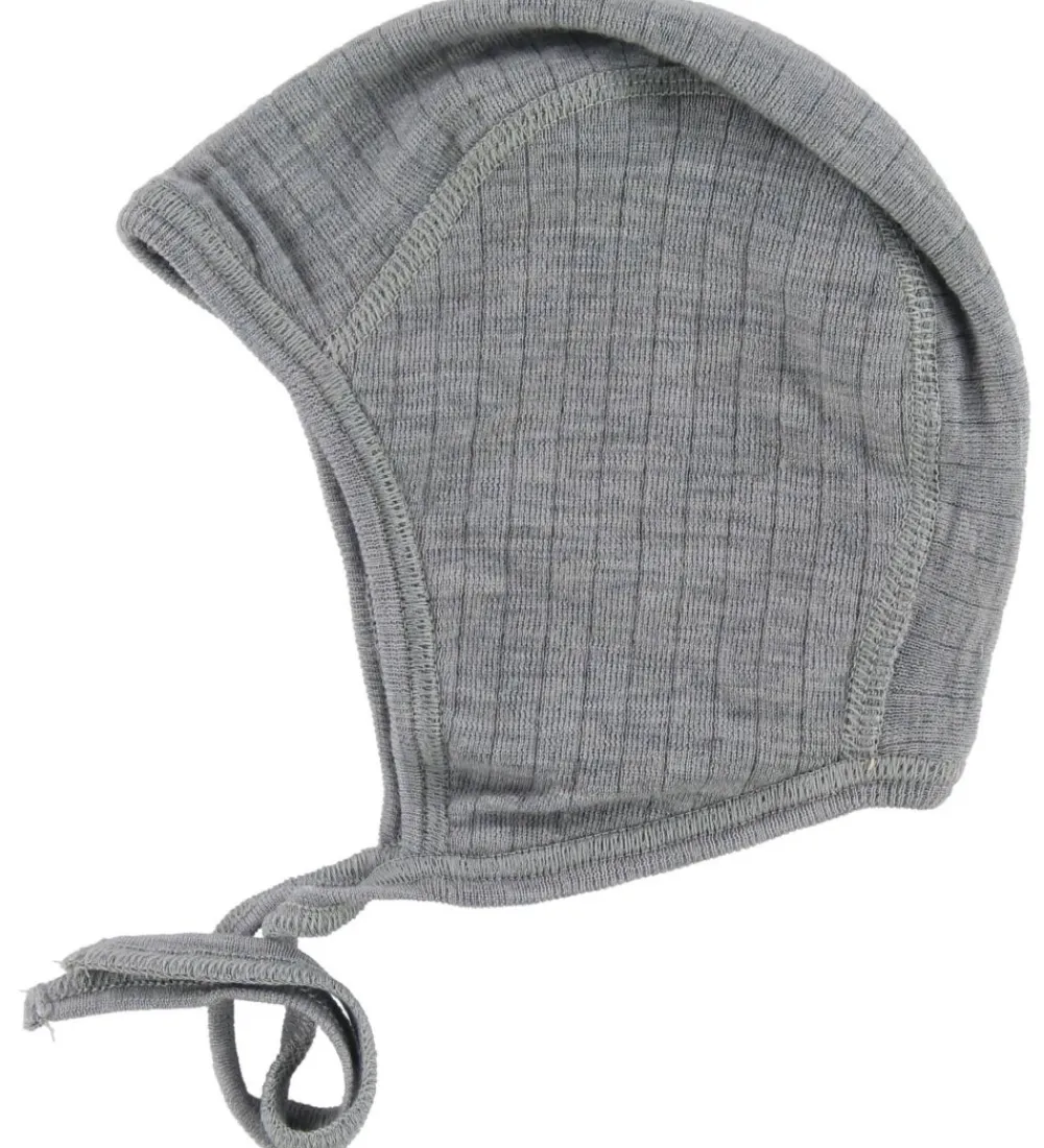 Hjelmen er ensfarvet grå med rib mønster og bindebånd.