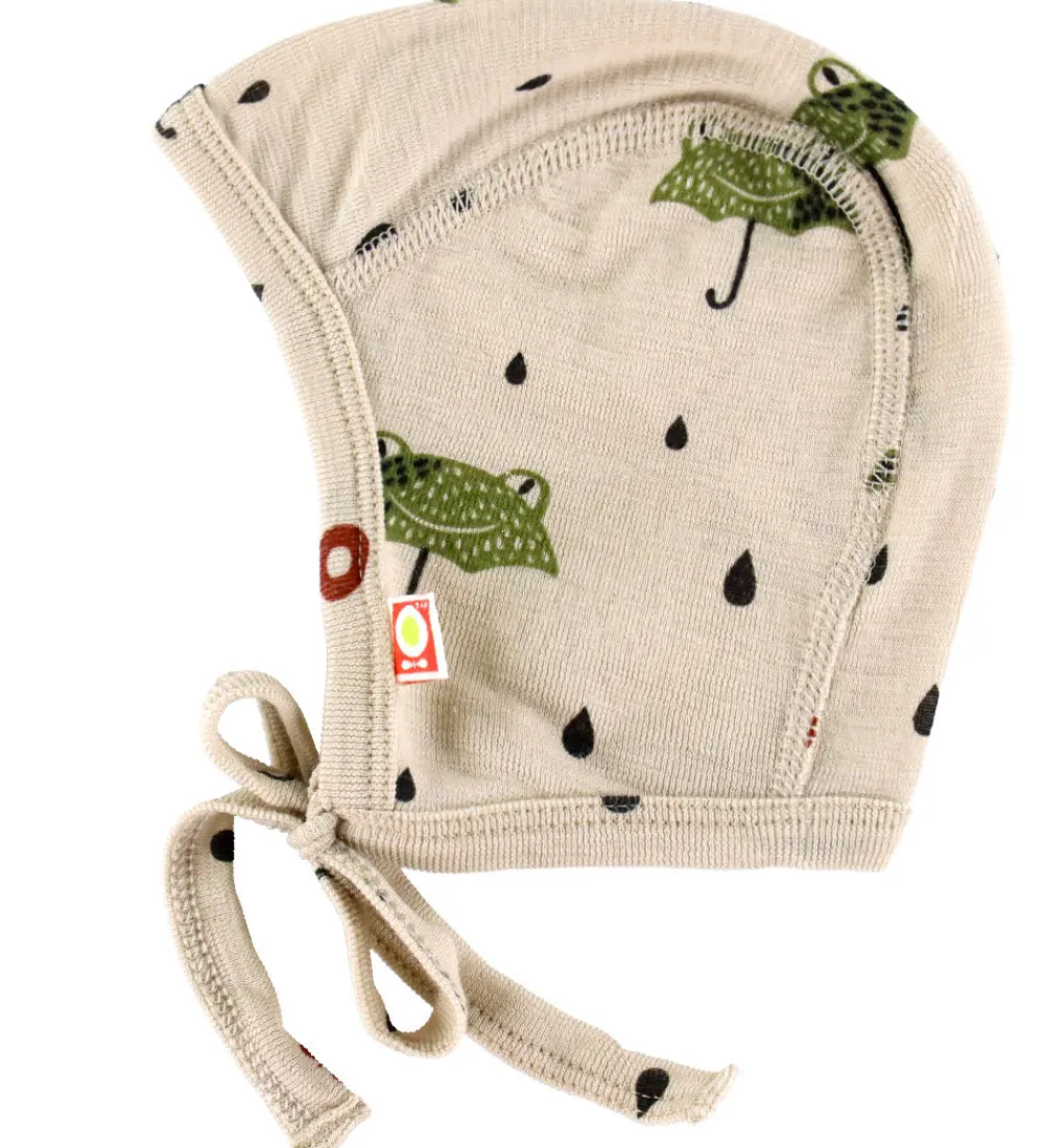 Skøn Katvig babyhjelm i en lys beige nuance med dekorative print af grønne frø-paraplyer og sorte regndråber. Katvig babyhjelmen har en rund hovedform, og den bindes under hagen med bindebånd. Babyhjelmen er fremstillet af økologisk merinould.