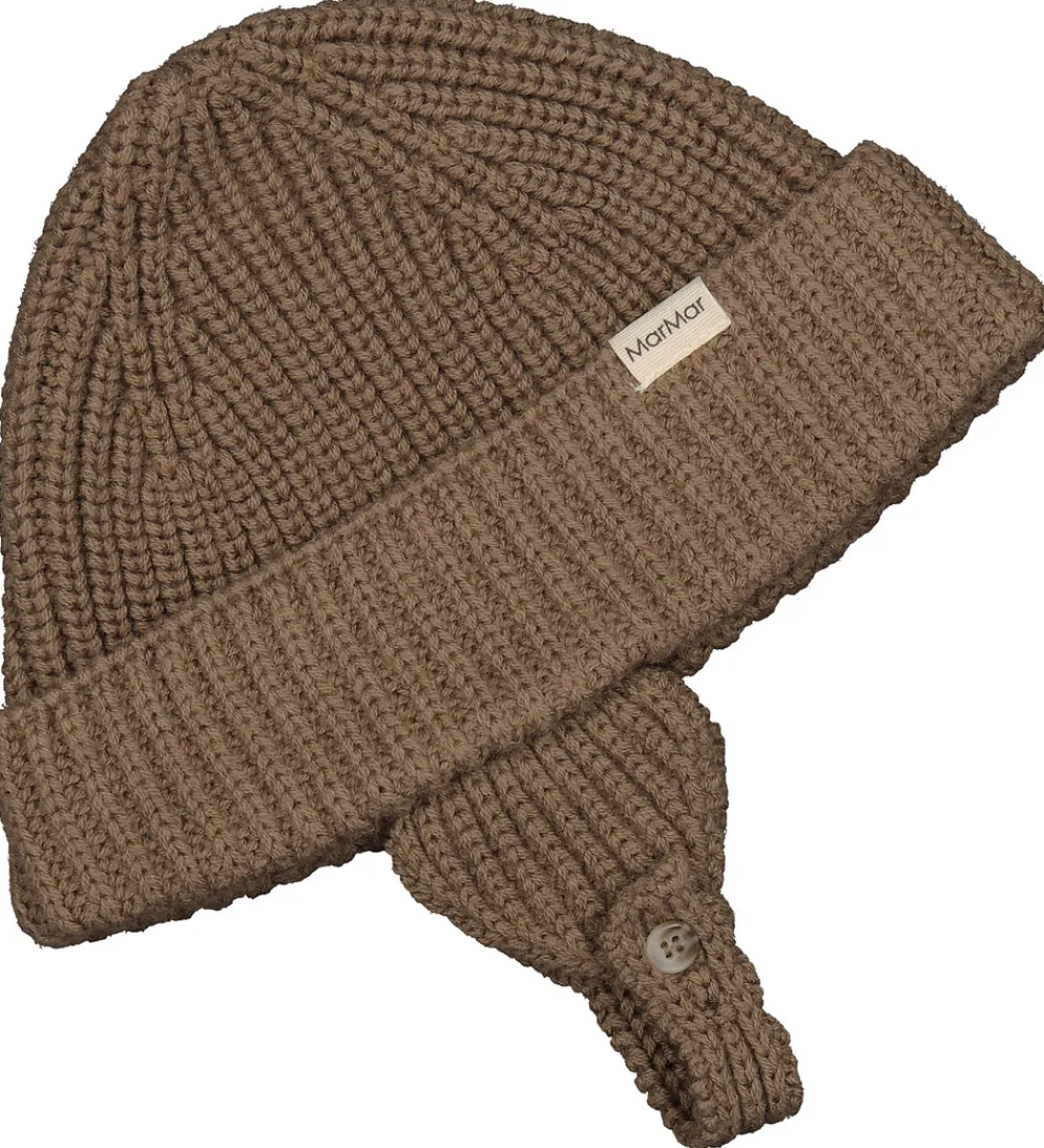 Lækker MarMar babyhue i ensfarvet brun i en strikket kvalitet med ribstruktur. Babyhuen har en rund hovedform, og en bred kant med ombuk. I siderne sidder der øreflapper, som beskytter ørerne godt, og babyhuen lukkes under hagen med en strikket rem med en lille knap.