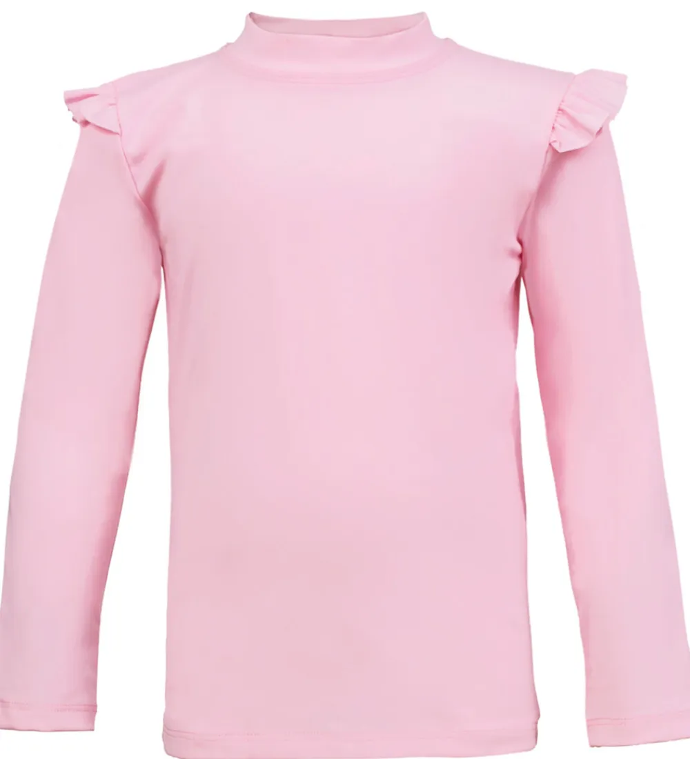 Lækker Petit Crabe badebluse i en lys rosa med et broderet logo nederst. Badeblusen har lange ærmer med flæser henover skuldrene, samt en høj hals.