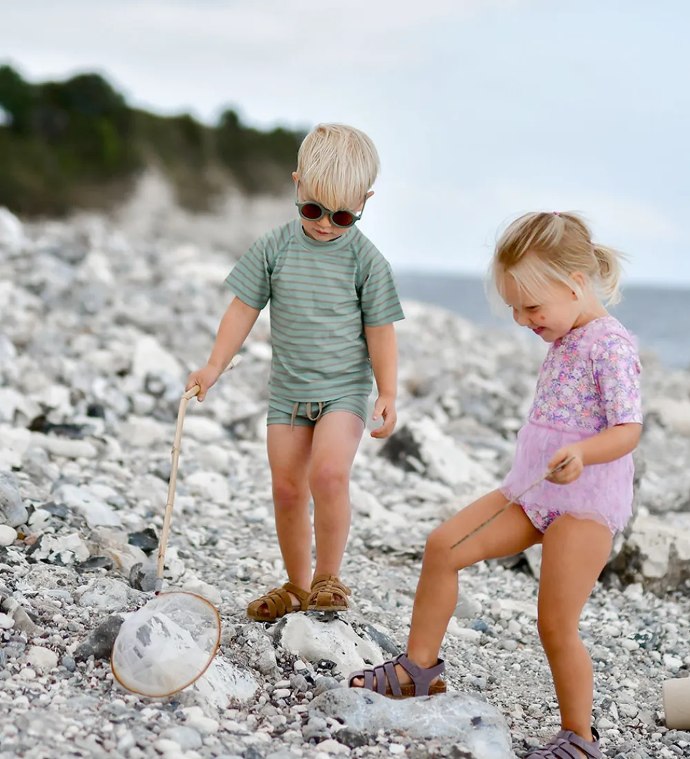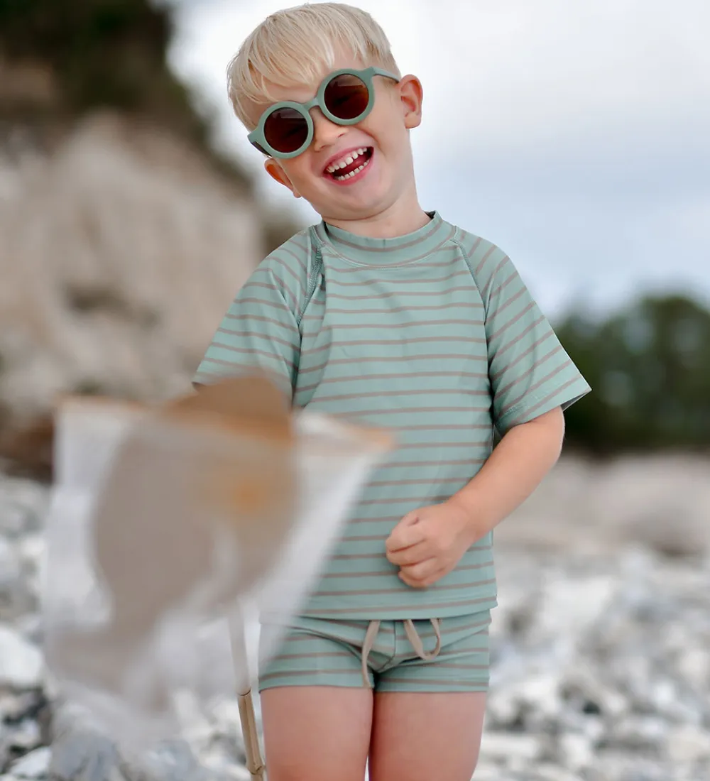 Flot Mikk-Line badebluse med korte ærmer i en frisk grøn nuance med vandrette striber. Mikk-Line badetøjet har en afslappet pasform, der gør det komfortabelt for børnene at bære.