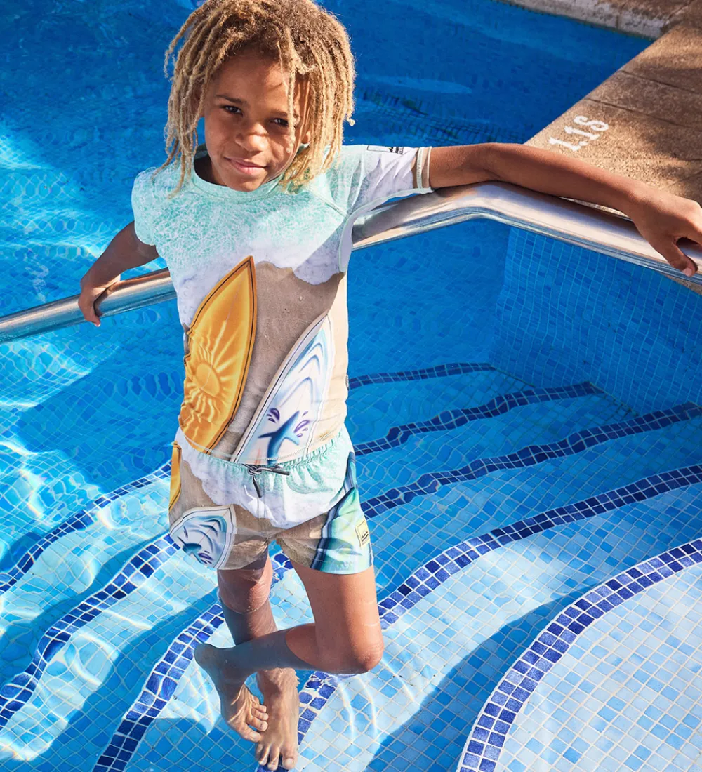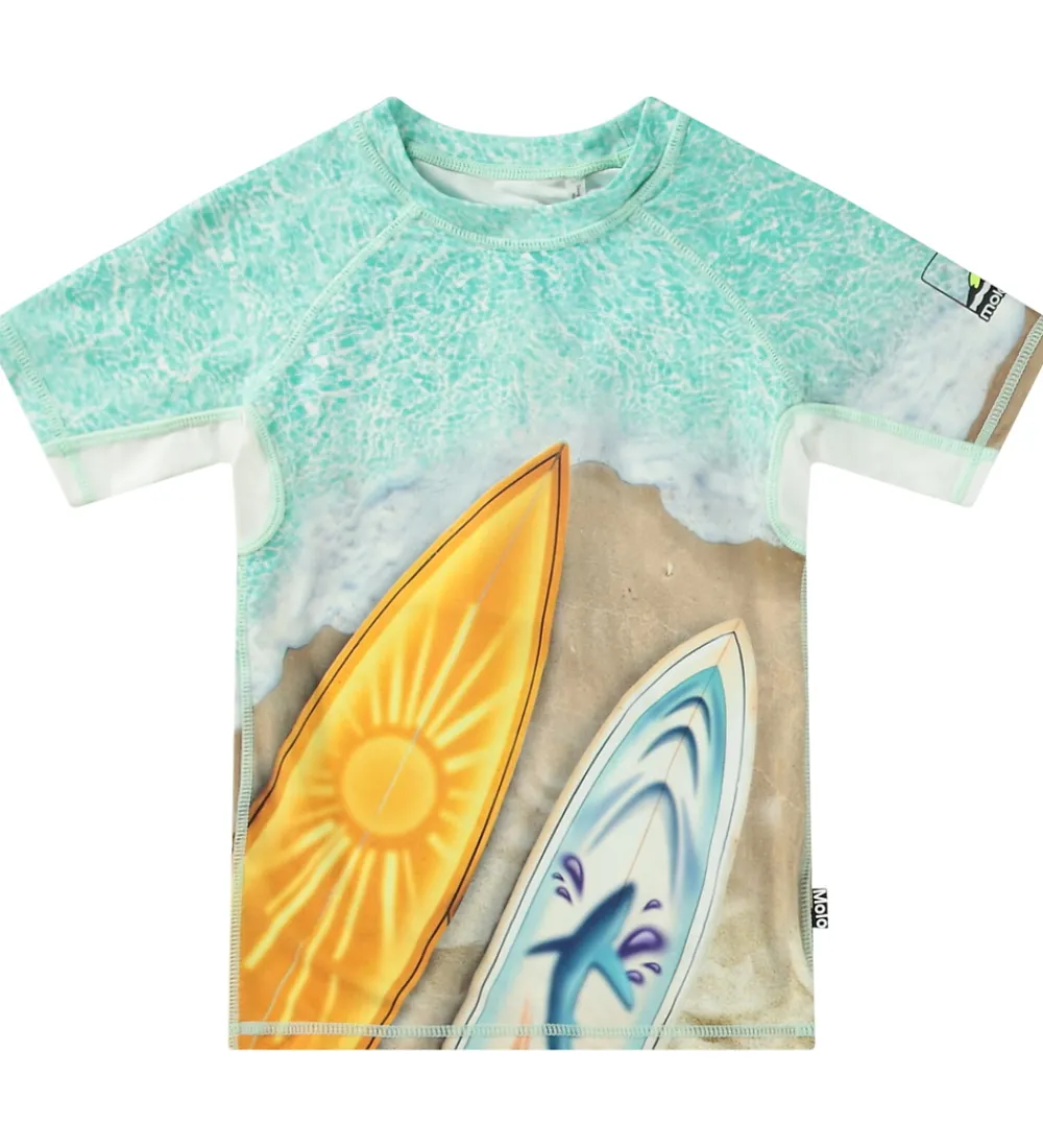 Flot Molo badebluse i sandfarvet og turkis med print af en strand og farverige surfboards. Badeblusen har en rund halsudskæring og korte ærmer.