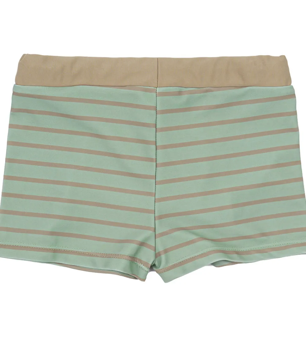 Smart Mikk-Line badetøj i en flot grøn med brune striber. Mikk-Line badetøjet har en behagelig pasform med justerbar snøre i taljen, der sikrer god komfort og holdbarhed.