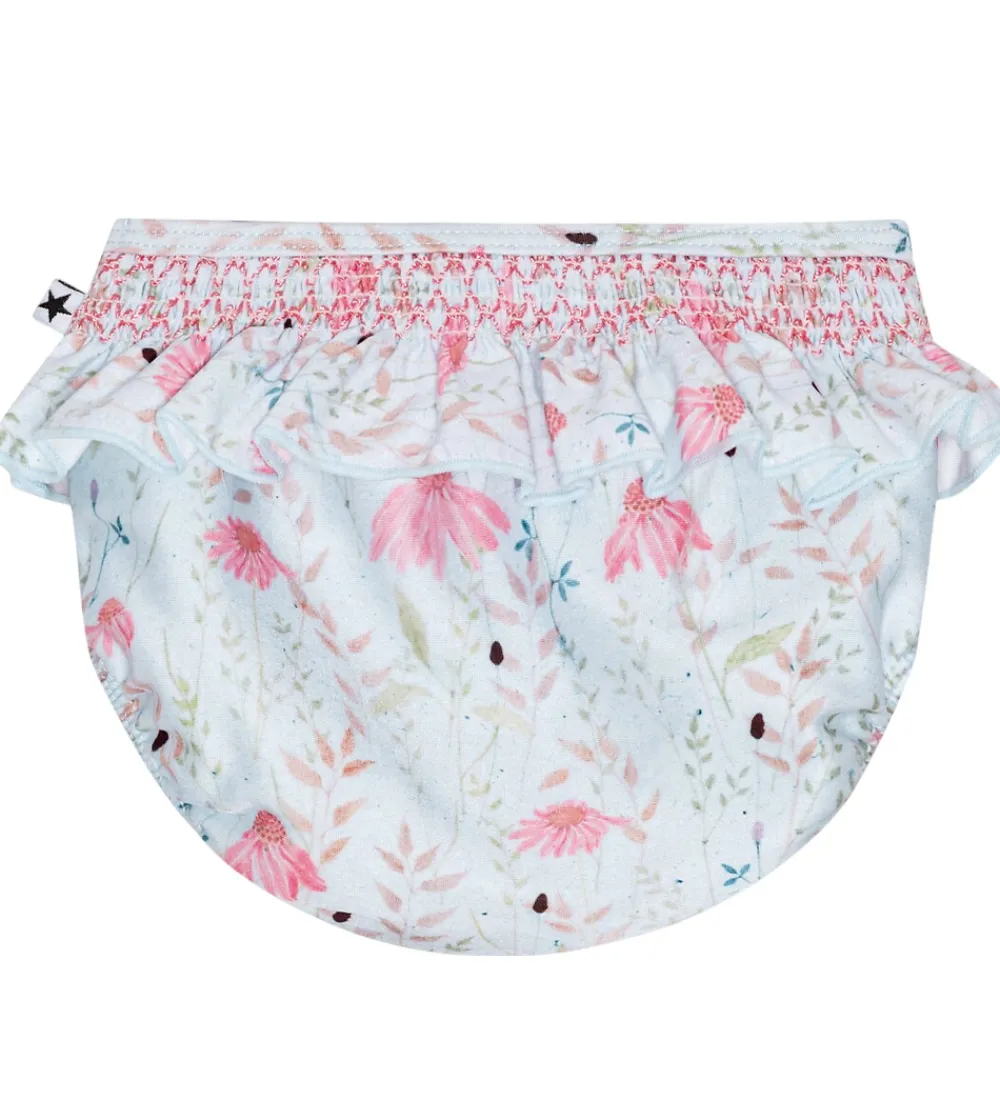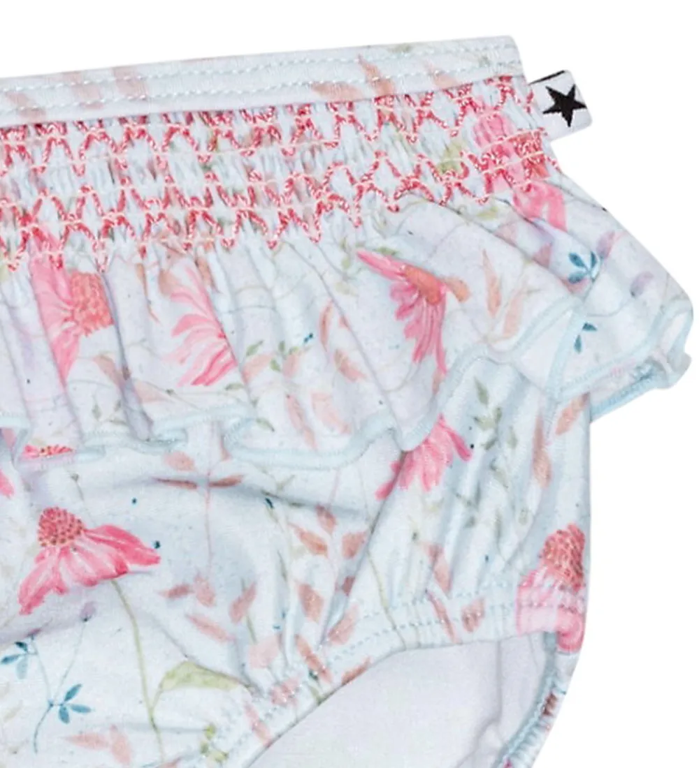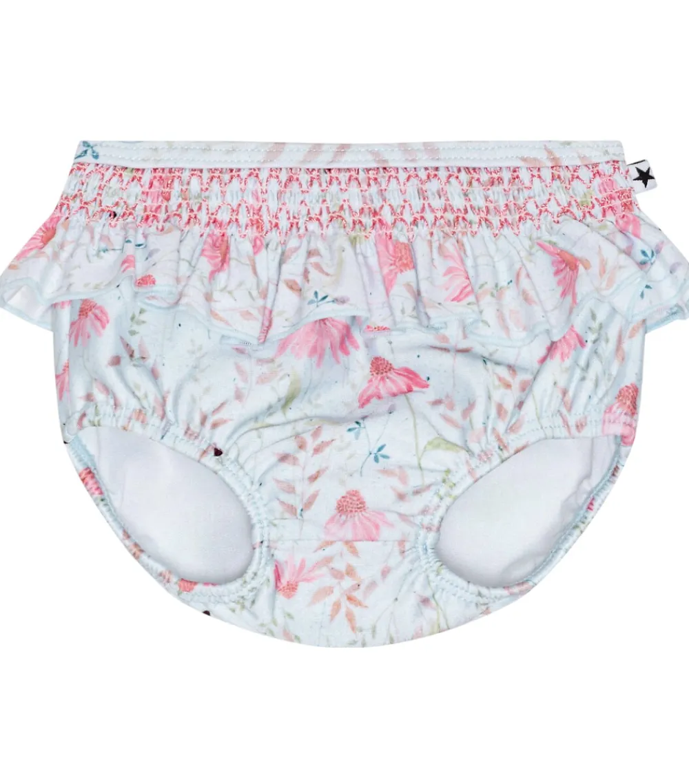 Fine Molo badebukser i lyseblå med rosa blomsterprint. Badebukserne har en bred, elastisk talje med en fin flæsekant. Badebukserne har elastik i benåbningerne og plads til en ble indenunder.