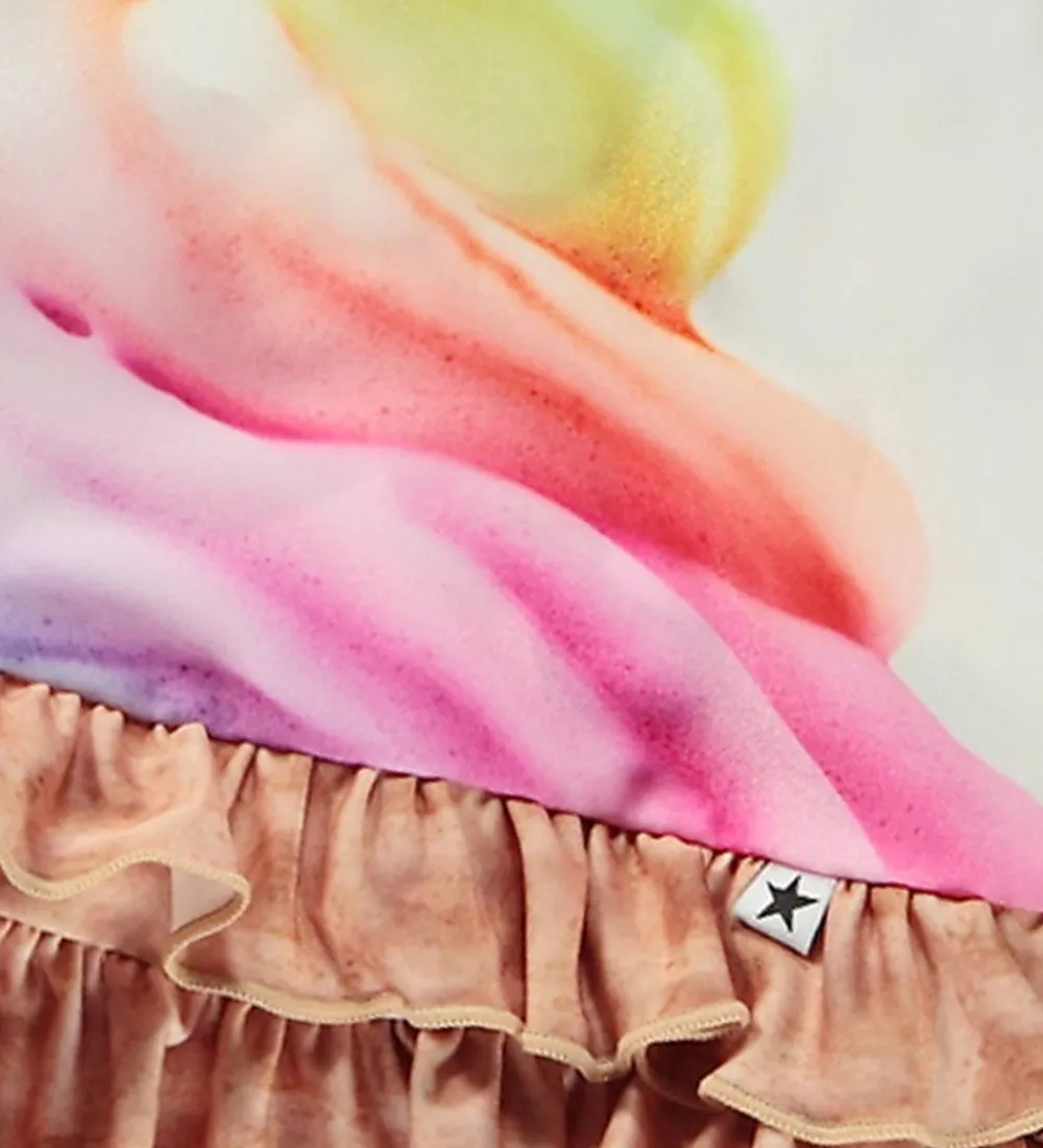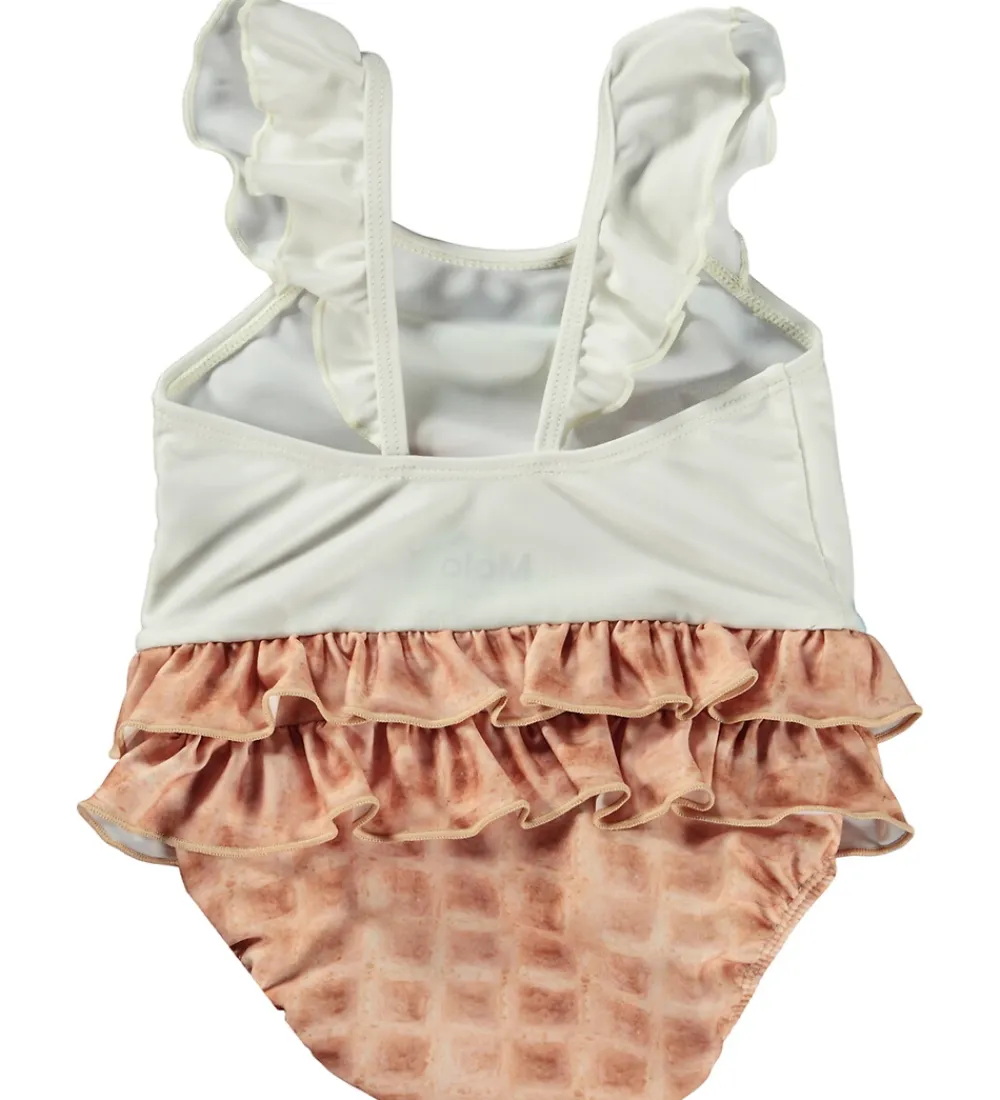 Smart Molo badedragt med print af en stor isvaffel i flotte farver. Badedragten har en rund halsudskæring og smalle skulderstropper med flæsedetaljer ved skuldrene. I taljen er der flæser og i benåbningerne er der elastik, som sikrer en god pasform.