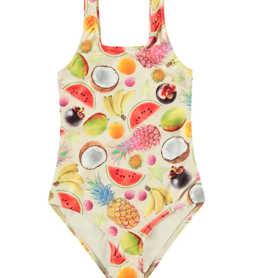 Molo badedragten har brede skulderstropper og en rund halsudskæring. Den har en dyb udskæring i ryggen og smalle elastikkanter i alle åbninger.
