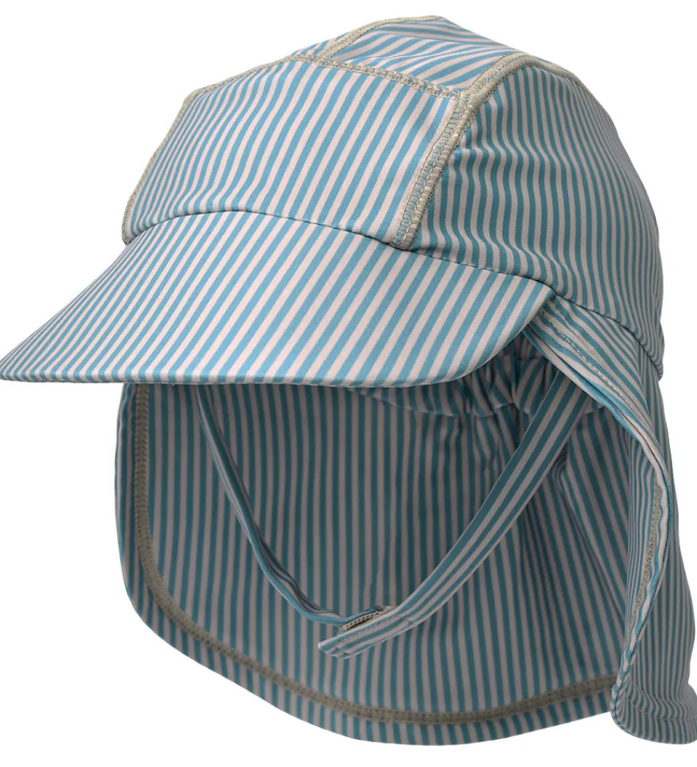 Stilfuld Wheat badehat i et elegant, stribet mønster med lyseblå og hvide nuancer, der skaber et klassisk look.