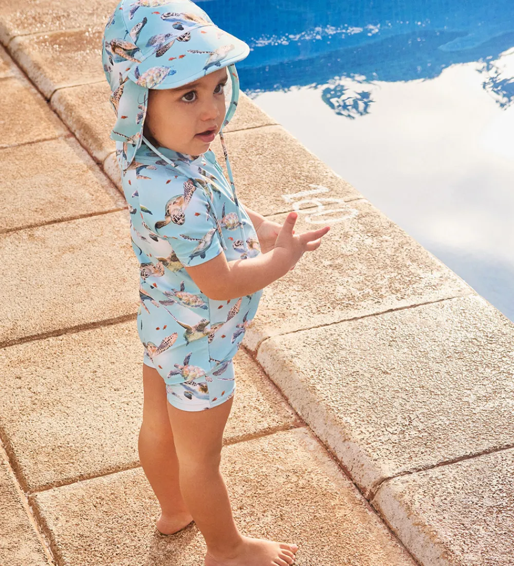 Flot badehat fra Molo i lyseblå med print af havskildpadder og små fisk.