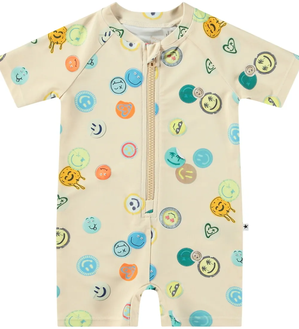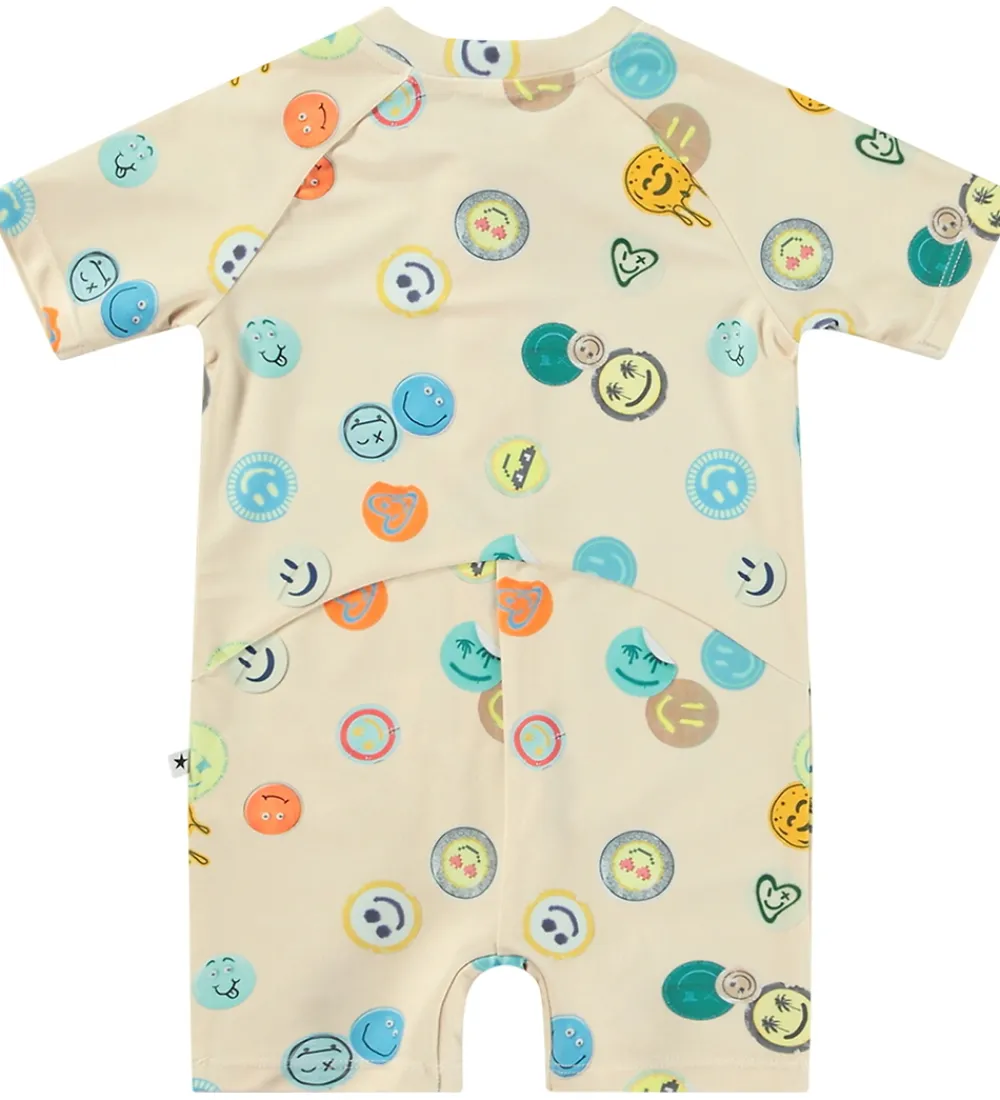 Smart Molo badeheldragt i beige med print af farverige smileys. Badeheldragten har en rund halsudskæring med en praktisk lynlås foran med hagebeskytter og indvendig vindstolpe. Badeheldragten har korte ærmer og korte ben.