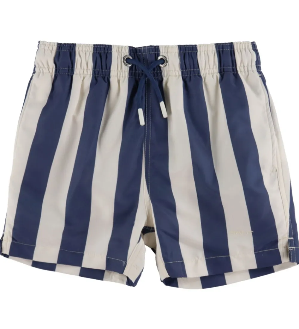 Stilfuldt GANT badetøj i hvide og blå med lodrette striber. GANT shortsene har en justerbar elastik i taljen med en praktisk snøre for optimal komfort og pasform. Perfekt til sommerens aktiviteter. I siderne er der praktiske lommer, og bagpå i højre side sidder der en lomme, som lukkes med velcro. På indersiden har badeshortsene et net af mesh.